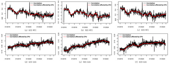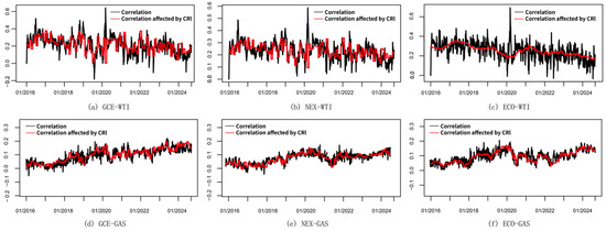 As shown in Figure 2, the long-term correlations between crude oil futures and clean energy indices under the influence of CPU fluctuate considerably. During certain extreme events, the climate policies have, to some extent, amplified the changes in the correlation between fossil fuels and clean energy assets. After the outbreak of COVID-19 in late 2019, the crude oil market was severely hit due to the suspension of transportation and industrial consumption. In contrast, clean energy assets demonstrated relative resilience. They are still supported by policy incentives since the electricity demand fell moderately. This divergence contributed to the correlation decline. Around September 2021, the European energy crisis sharply increased fossil fuel demand. The Russia–Ukraine war in February 2022 further intensified fears of fossil fuel supply shortages. In response, policy priorities gradually shifted toward energy security, leading to higher climate policy uncertainty. Investors temporarily increased allocations to traditional energy, while clean energy companies were constrained by supply chain bottlenecks and tighter financial conditions. As a result, the downward fluctuation in correlations was amplified. Overall, throughout the study period, crude oil and clean energy markets exhibit a decoupling trend, with correlations stabilizing in recent years at a relatively low positive level.