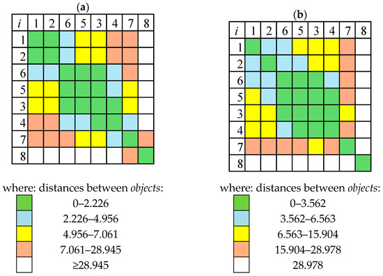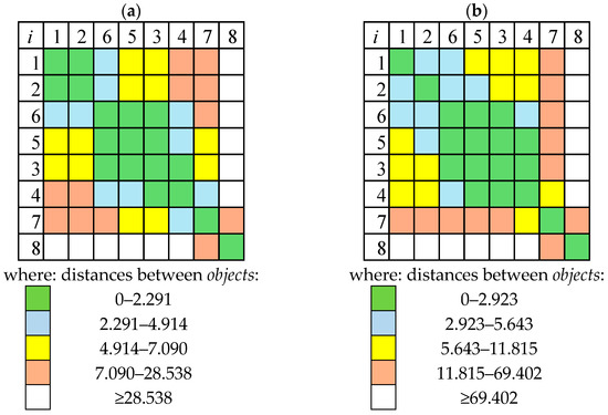 All distance measures are divided into several classes, each assigned a graphical symbol. It should be noted that in Czekanowski’s method, the degree of fit is influenced by various subjective factors, such as the assumed average difference between the analyzed objects. The requirement for maximum concentration of objects along the main diagonal can only be achieved through successive approximations. As the final outcome of applying Czekanowski’s method, a so-called ordered distance matrix between objects is obtained. The resulting linear ordering of classified objects enables the identification of clusters—groups of objects located close to each other in multidimensional space.