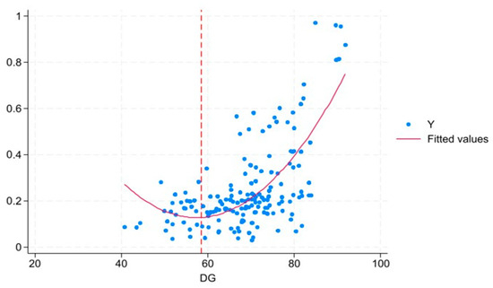 Figure 1 depicts the relationship between DG and common prosperity through a scatter plot. The red solid line represents the U-shaped fitting curve of the degree of DG and common prosperity. The intersection of the red solid line and the dotted line is the extreme point. The results represent that the scattered points are distributed around the U-shaped curve, indicating that DG initially inhibits common prosperity and then promotes it. This graphical evidence provides preliminary support for Hypothesis 1. Subsequent analyses apply a two-way fixed effects model (FE) to further examine.