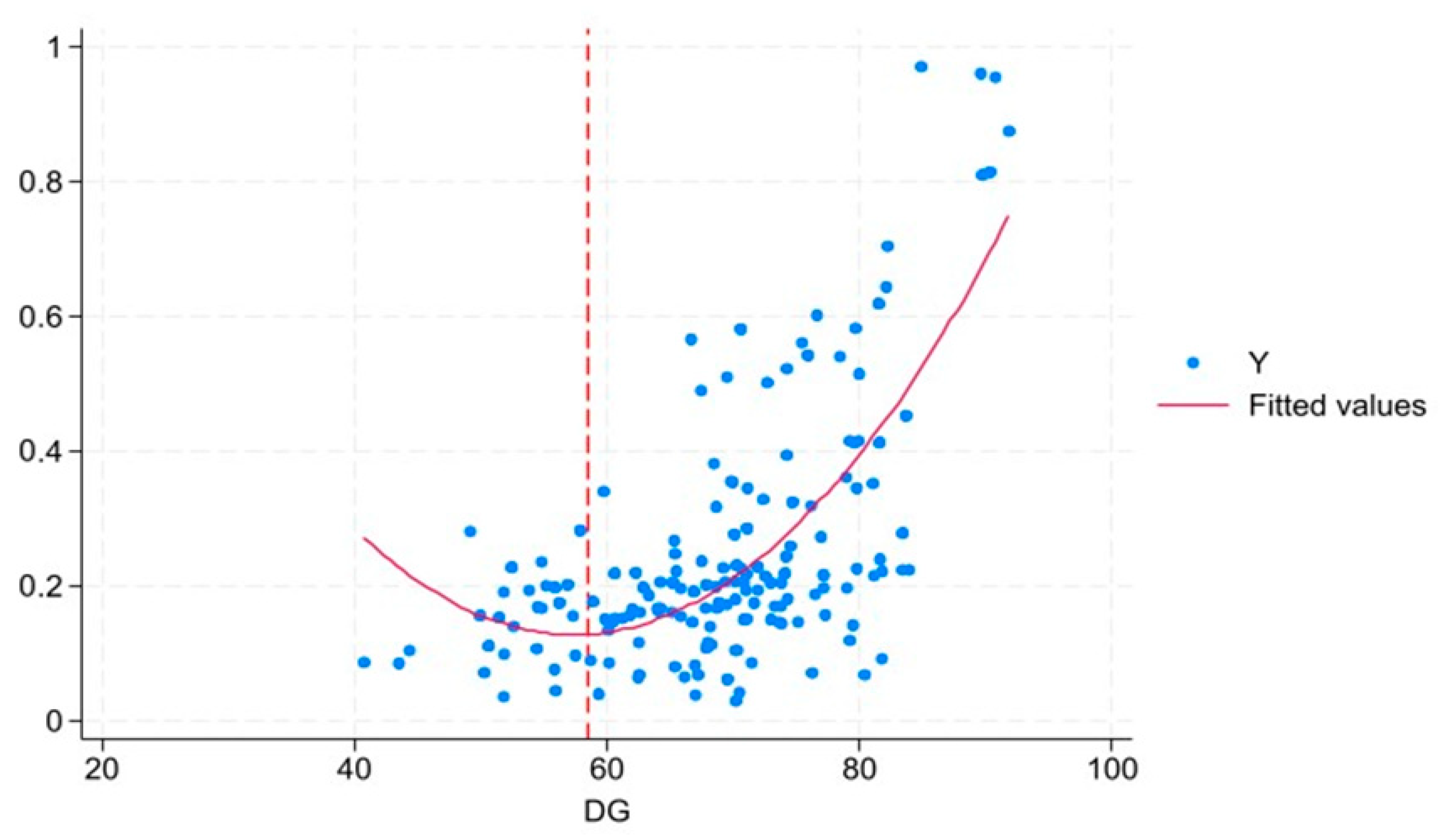 Furthermore, the multidimensional nature of DG offers a robust foundation for examining its differential effects on common prosperity. In terms of individual dimensions, both service supply capacity and service intelligence capacity show significant U-shaped relationships with common prosperity, whereas service responsiveness shows only a weak influence. These findings suggest that DG generates heterogeneous effects across distinct functional domains, thereby extending and enriching existing literature [