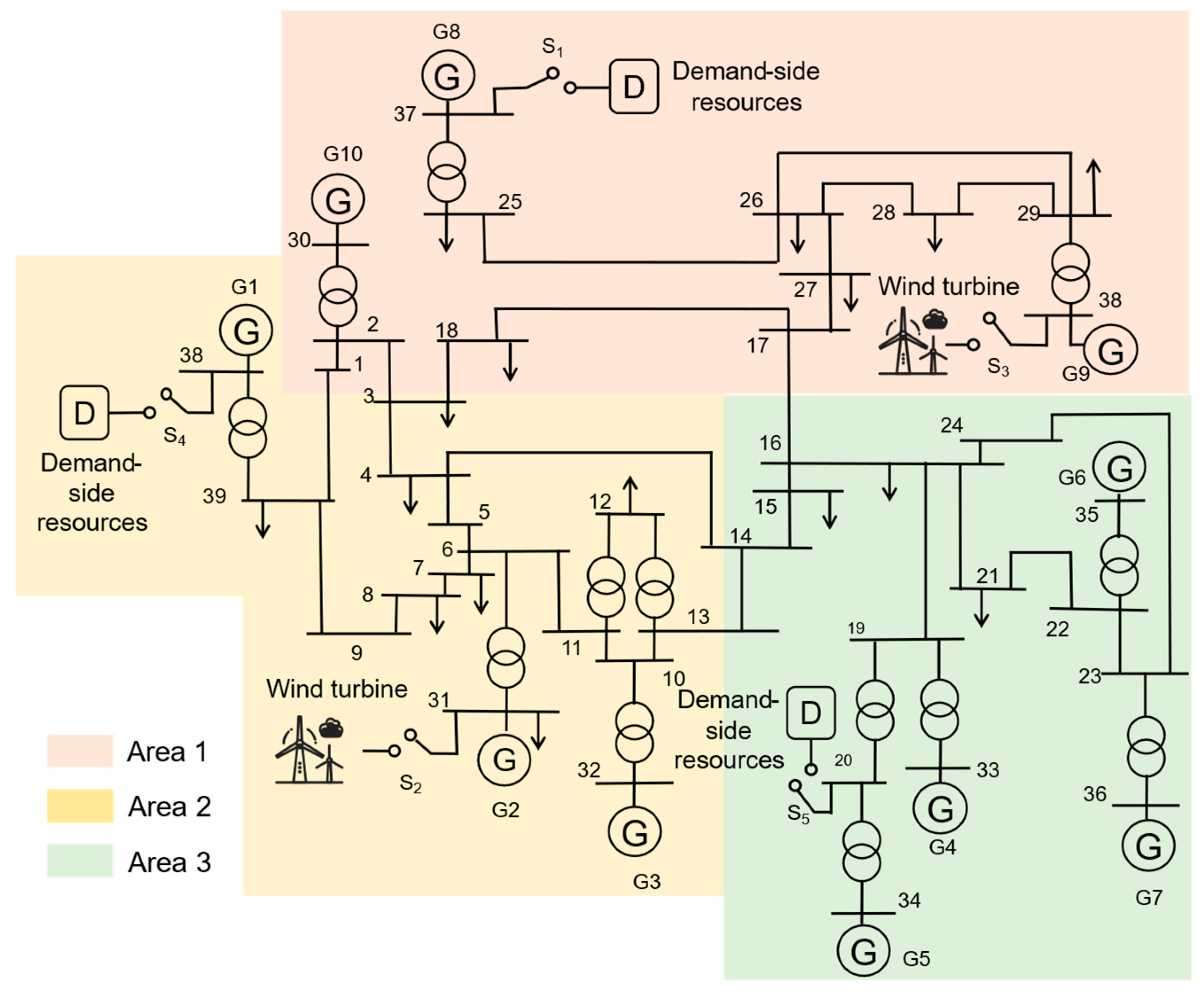Figure 2 incorporates changes in both renewable energy integration and demand-side resource deployment. Specifically, wind farms are connected at buses 31 and 38, while flexible loads are installed at buses 37, 38, and 20. Area 1 comprises 500 demand-side resources, Area 2 comprises 1000, and Area 3 comprises 1500, each with a controllable power range of 1–2 kW. The parameters of the modified New England 39-bus system, the wind farms, and the demand-side resources are provided in [