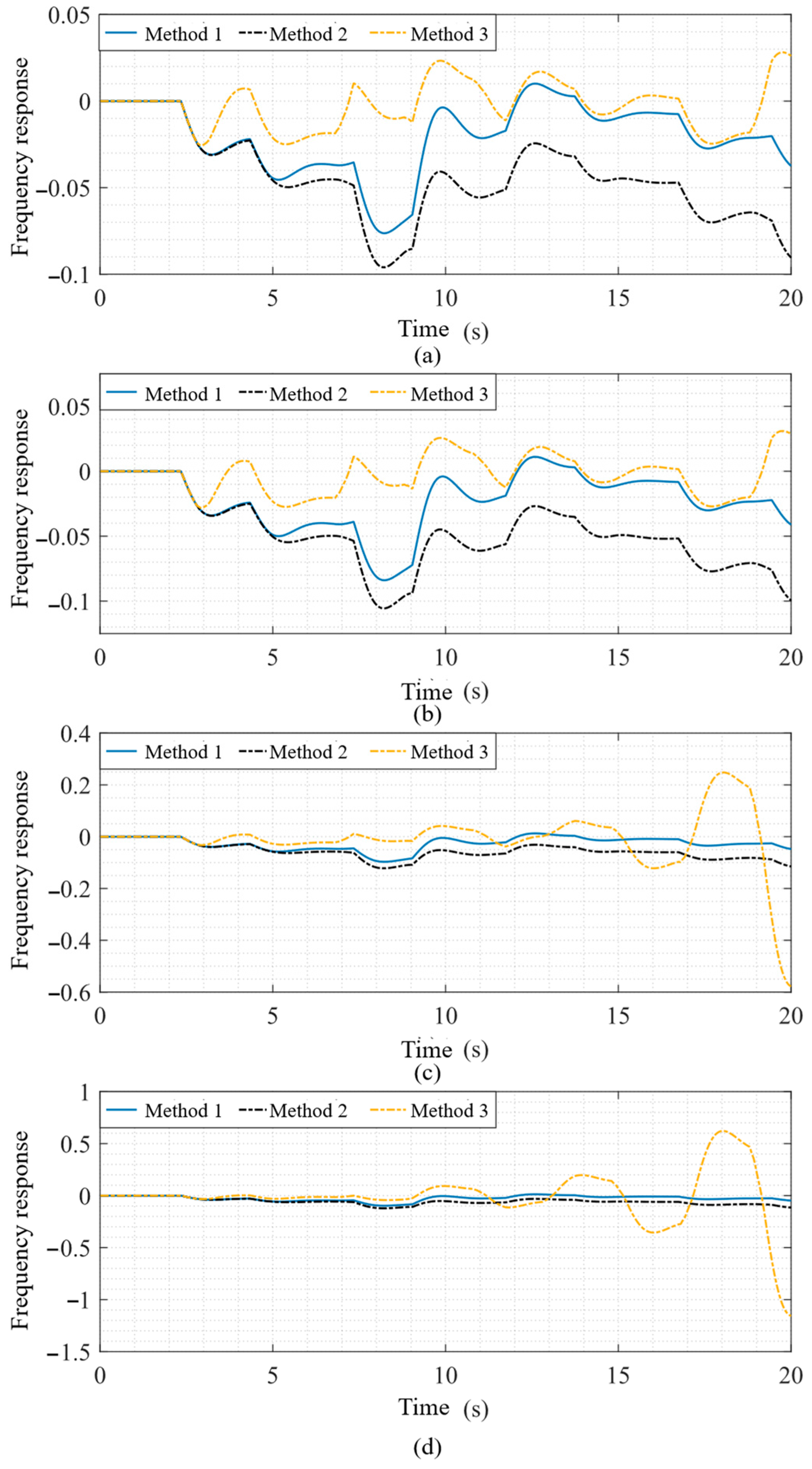 f = 0), with a smaller nadir and shorter settling time. This is because, under constant synchronous and constant asynchronous delays, the delays are deterministic. Moreover, Method 3 adopts a full-state feedback control strategy, providing richer state information than Methods 1 and 2, thereby achieving better frequency performance.