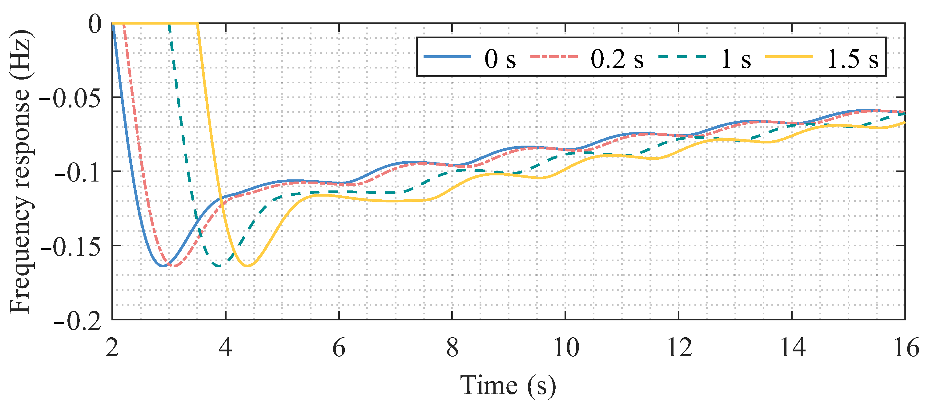 Figure 7 presents the system’s frequency performance under different response delays, including 0 s, 0.2 s, 1.0 s, and 1.5 s. As shown in