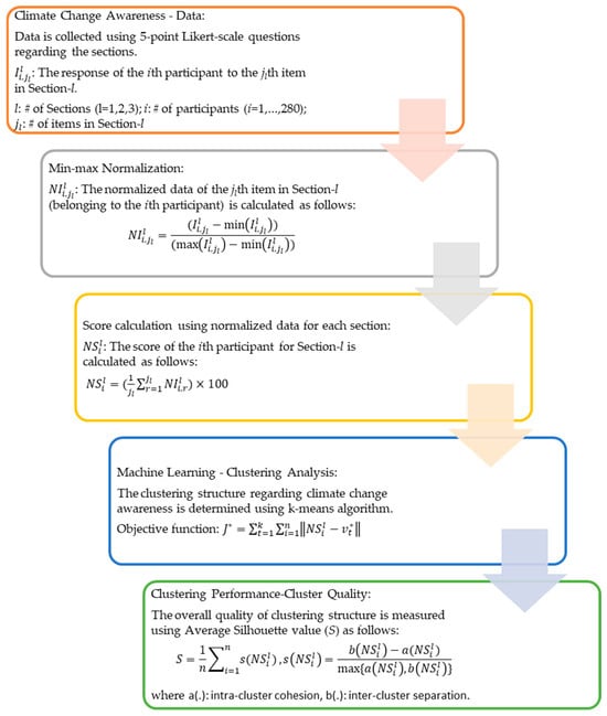 Cluster analysis was performed to examine the similarities and differences in knowledge and awareness of climate change among the relevant preparatory class students. The data collected via the climate change awareness survey were normalized to the [0, 1] range using the min–max method. Accordingly, participant scores were computed for the sections of the climate change awareness survey comprising 5-point Likert-type items. A section scores dataset of dimensions 280 × 3 was constructed using the participants’ scores for the respective sections. K-means clustering [39], one of the well-known techniques of machine learning, was performed on this section-scores dataset to evaluate participants’ knowledge and awareness toward climate change. Due to the unsupervised nature of k-means algorithm, the Silhouette index [40] was used to determine the appropriate number of clusters affecting cluster quality. The framework of the clustering-based approach to climate change awareness assessments is presented in Figure 1.