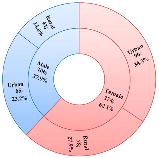 62.1% of survey participants were female (n = 174; mean age = 19.87 and standard deviation/SD = 1.77), and 37.9% were male (n = 106; mean age = 19.91 and standard deviation/SD = 1.94). 57.5% of participants reside in urban areas/center (n = 161), while 42.5% reside in rural areas (n = 119). The gender and residence distributions of the participants are illustrated in Figure 2.