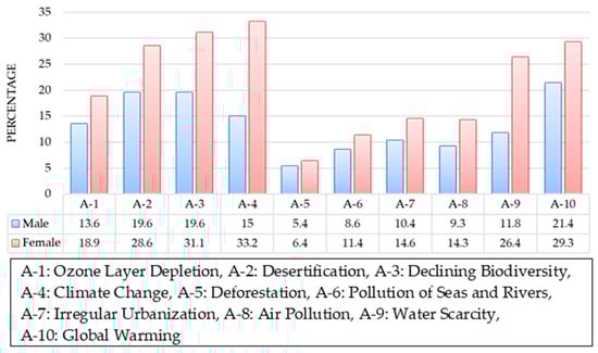 According to participants, the environmental issues causing the most concern were Declining Biodiversity (A-3) and Global Warming (A-10) in first place (n = 142, 50.7%), Desertification (A-2) and Climate Change (A-4) in second place (n = 135, 48.2%), Water Scarcity (A-9) ranked third (n = 107, 38.2%), Ozone Layer Depletion (A-1) ranked fourth (n = 91, 32.5%), Irregular Urbanization (A-7) ranked fifth (n = 70, 25.0%), Air Pollution (A-8) ranked sixth (n = 66, 23.6%), Pollution of Seas and Rivers (A-6) ranked seventh (n = 56, 20.0%), and Deforestation (A-5) ranked eighth (n = 33, 11.8%). The distribution of environmental issues causing the greatest concern by gender is shown in Figure 3.