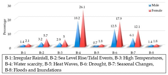 When participants think of climate change, the first concept that comes to mind is Water scarcity (B-4) in first place (n = 124, 44.3%), followed by Drought (B-6) in second place (n = 85, 30.4%), Seasonal Changes (B-7) came third (n = 51, 18.2%), Sea Level Rise/Tidal Events (B-2) came fourth (n = 25, 8.9%), High Temperatures (B-3) came fifth (n = 22, 7.9%), Irregular Rainfall (B-1) ranked sixth (n = 10, 3.5%), Floods and Inundations (B-8) ranked seventh (n = 9, 3.2%), Heat Waves (B-5) ranked eighth (n = 7, 2.5%). When it comes to climate change by gender, the first concepts that come to mind are as shown in Figure 4.