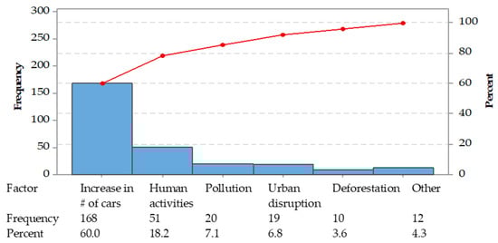 Participants identified the factors causing climate change as Cutting down trees (n = 9, 3.2%), Deforestation (n = 10, 3.6%), Increase in the number of cars (n = 168, 60.0%), Increased use of airplanes (n = 1, 0.4%), Human activities (n = 51, 18.2%), Pollution (n = 20, 7.1%), Greenhouse gases (n = 2, 0.7%), and Urban disruption (n = 19, 6.8%). At this stage, Pareto analysis was employed to determine the most critical factors contributing to climate change. Pareto chart of factors causing climate change among participants is presented in Figure 5. According to Figure 5, the two most critical factors contributing to climate change are the increase in the number of cars (n = 168, 60.0%) and human activities (n = 51, 18.2%).