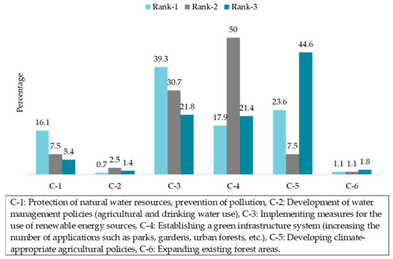 Participants believe that the following should be prioritized in adaptation efforts related to climate change: “C-1: Protection of natural water resources, prevention of pollution, C-2: Development of water management policies (agricultural and drinking water use), C-3: Implementing measures for the use of renewable energy sources, C-4: Establishing a green infrastructure system (increasing the number of applications such as parks, gardens, urban forests, etc.), C-5: Developing climate-appropriate agricultural policies, C-6: Expanding existing forest areas.” The top three preference rankings for these items are as shown in Figure 6. According to Figure 6, C-4: Establishing a green infrastructure system (increasing the number of applications such as parks, gardens, urban forests, etc.) was the most frequently selected option by participants at 50% (n = 140).