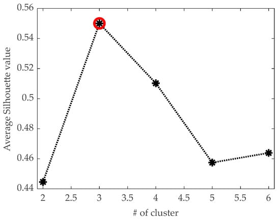 Data preprocessing for climate change awareness-based clustering was performed as in Figure 1. Student responses (n = 280) were collected using 5-point Likert-type questions for the items listed in Table 1. These collected data were normalized using min-max method. Then the normalized data were converted to section scores based on a 100-point system. Clustering of the relevant scores-data was performed using the k-means algorithm, one of the unsupervised machine learning techniques, for different cluster numbers (k = 2, …, 6). The average Silhouette values for the relevant scores data (280 × 3 dimensional data) were found as shown in Figure 7. According to Figure 7, the optimal number of clusters corresponding to the highest average Silhouette value () is three (k = 3). Therefore, for the clustering analysis using the normalized section-scores, the number of clusters was set to three to ensure appropriate cluster quality.