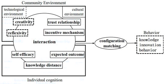 - Individual cognition. Specifically, it includes three secondary conditions: self-efficacy, expected outcome, and knowledge distance. Self-efficacy refers to an individual’s perception and judgment about their ability to complete a specific activity. In the digital learning community, learners with high self-efficacy typically possess comprehensive abilities. They are more confident that they can overcome the difficulties in the process of knowledge innovation, contribute more valuable new ideas and new methods, and promote knowledge innovation [41]. The expected outcome is the learner’s cognitive judgment of the possible results brought by their knowledge innovation behavior. According to expectancy theory, whether the individual’s expectation of the behavior result is positive or negative is an essential factor in the occurrence and maintenance of behavior [42]. A positive expected outcome can contribute to learners’ knowledge and informed decisions about innovative behavior. For example, learners will have a positive attitude towards knowledge innovation if they gain external or internal benefits, including financial rewards, promotion, or self-satisfaction, as well as social recognition [43]; on the contrary, a negative expected outcome will inhibit learners’ behavioral decision-making. Knowledge distance is the gap or degree of dissimilarity between learners’ knowledge level or knowledge content [29]. It is an essential antecedent variable that affects knowledge innovation. According to the knowledge potential theory, the small knowledge distance between the two sides means that the knowledge potential difference between each other in a teaching assistant’s field is slight, which is conducive to the absorption of the received knowledge by learners, providing favorable conditions for knowledge evolution and realizing knowledge co-creation [30,44].