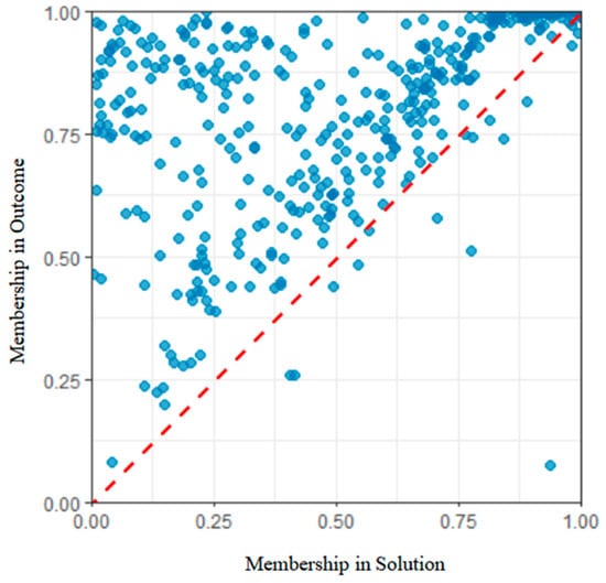 To further validate the robustness of the configurational analysis results, this study constructed an XY scatter plot to depict the relationship between the overall solution and the outcome variable, in accordance with the methodological framework of fuzzy-set qualitative comparative analysis (fsQCA) [50], as shown in Figure 2. As a core diagnostic tool for assessing configurational adequacy in fsQCA, the XY scatter plot visually represents the association between antecedent configuration membership and outcome variable membership, thereby providing empirical support for evaluating solution consistency [62].