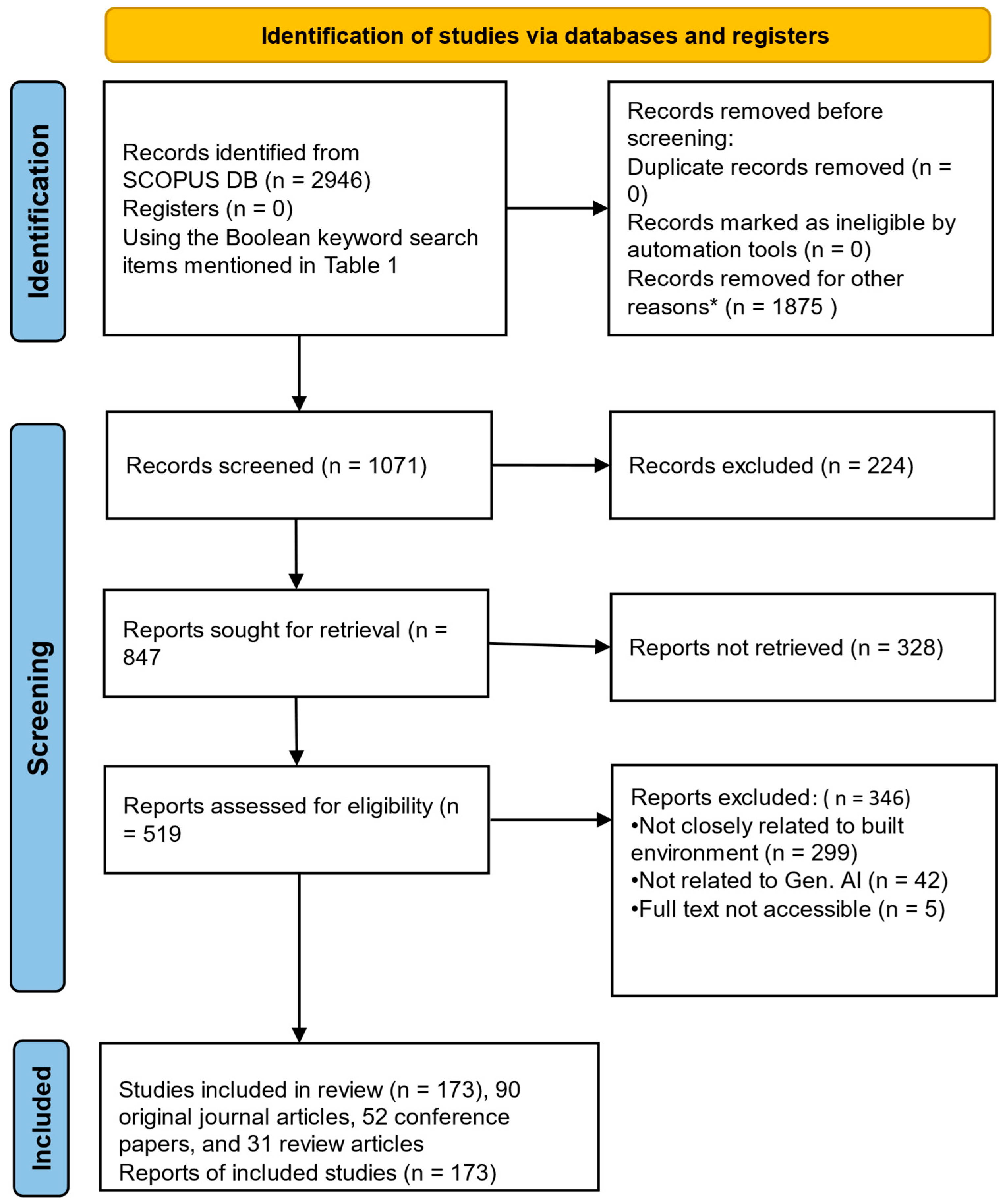 - Research Question 2 (RQ2): What are the main challenges and barriers identified in the literature regarding the implementation of GAI for sustainable practices in buildings and infrastructure projects?