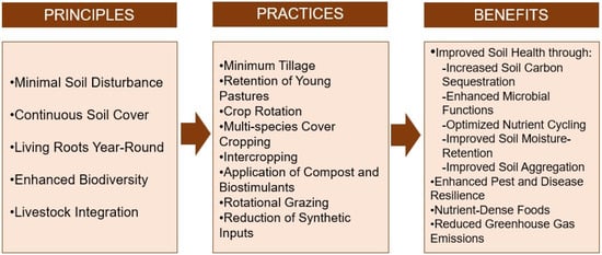 Supporters of RA claim that these methods will prevent soil erosion and depletion, provide crops with adequate nutrients, increase farmers’ income and improve human health [,,,,,,,]. The soil, agronomic, and environmental benefits of RA are summarized in Table 1.