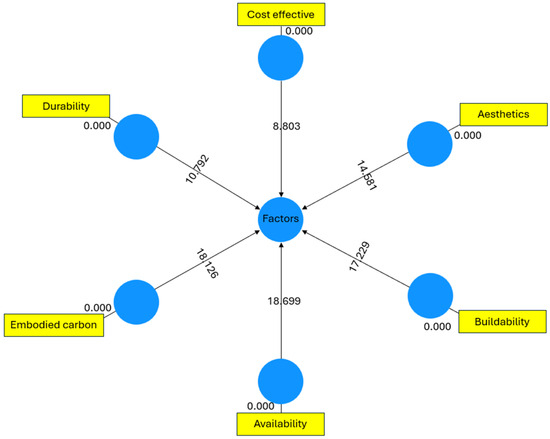 A one-sample t-test was employed to assess whether the mean score for each factor (e.g., cost-effectiveness, durability, embodied carbon) differed from the neutral midpoint of 3 on the 5-point Likert scale. The choice of a parametric t-test, rather than a non-parametric alternative, was justified based on prior evidence that Likert-type composite scores can be treated as approximately continuous when aggregated across multiple items, provided that the distribution meets the assumptions of normality [46]. Before running the t-test, we assessed the normality of the data for each factor using the Shapiro–Wilk test, supported by skewness and kurtosis statistics, all of which indicated that deviations from normality were minimal. The assumption of independence of observations was met, as each participant completed the survey individually and only once.