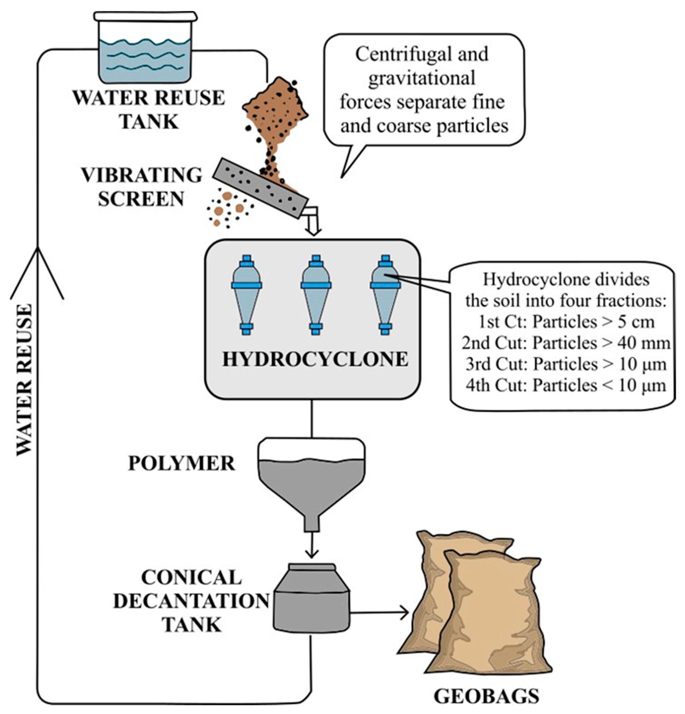 - Double-stage hydrocycloning: The contaminated soil is washed and subjected to successive cycles of particle size separation to isolate finer particles.