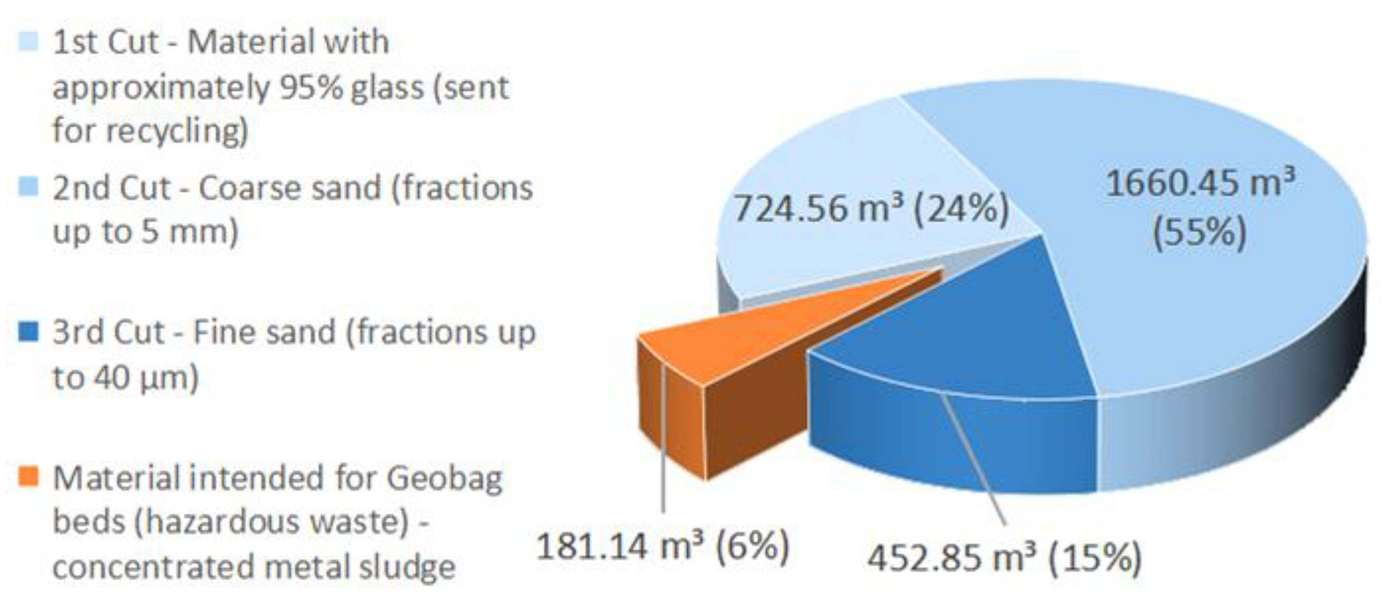 - Closed-loop circuit: The clarified water is recirculated back into the system. At the same time, the sludge containing the concentrated contaminants is transferred to geotextile dewatering bags (geobags) for drying and subsequent disposal in a licensed landfill [41].