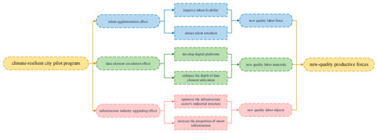 The Pilot Policy for Climate-Adaptive Urban Development centers on systematically enhancing urban resilience and adaptive capacity. It aims to establish a sustainable support environment for cultivating and developing new productive forces, achieving a strategic shift from “risk mitigation” to “development empowerment.” This policy focuses on strengthening the climate responsiveness of urban physical infrastructure and ecosystems. By advancing disaster prevention information systems, green infrastructure, and intelligent monitoring systems, it reduces the impact of extreme weather events on urban economic systems and minimizes “disturbance costs,” thereby ensuring the continuity and stability of business operations [26]. This process not only optimizes the long-term investment environment but, more importantly, empowers new productive forces at a deeper level. On one hand, a highly stable urban operational foundation provides reliable testing grounds and application scenarios for critical technological innovations, facilitating the integration and breakthroughs of emerging technologies such as green technologies, information technologies, and manufacturing technologies [27]. On the other hand, secure and efficient energy networks, transportation systems, and digital information and communication facilities significantly enhance the allocation efficiency of advanced factors like data, talent, and capital, driving the intelligent and green transformation of industries [28]. Furthermore, the risk prevention and control system established by policies has reduced uncertainties in financial transactions, bolstering market entities’ confidence in investing in long-term innovative technologies [29]. Thus, climate-adaptive city pilot programs are not merely defensive strategies against climate risks. They serve as a lever for resilience-building, systematically unlocking the value chain linking “infrastructure resilience—economic stability—productivity leap.” This provides robust support for the continuous evolution of new productive forces within a secure, open, and efficient urban environment. Based on the above, this study proposes Hypothesis 1: