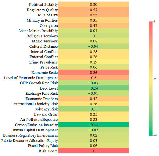 As illustrated in Figure 2, nine risk indicators exhibit absolute correlation coefficients with the risk score greater than 0.35. These key indicators are: “Political Stability”, “Regulatory Quality”, “Rule of Law”, “Military in Politics”, “Corruption”, “Economic Scale”, “Level of Economic Development”, “Economic Freedom”, and “Carbon Emission Intensity”. Consequently, these nine risk factors exert the most significant influence on the overall risk assessment.
