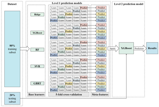 This study combines Ridge Regression, SVR, RF, XGBoost, and GBRT as base learners, with XGBoost serving as the meta-learner (Figure 3). This architecture efficiently consolidates meta-features to make precise final predictions [47]. The Stacking implementation comprises: