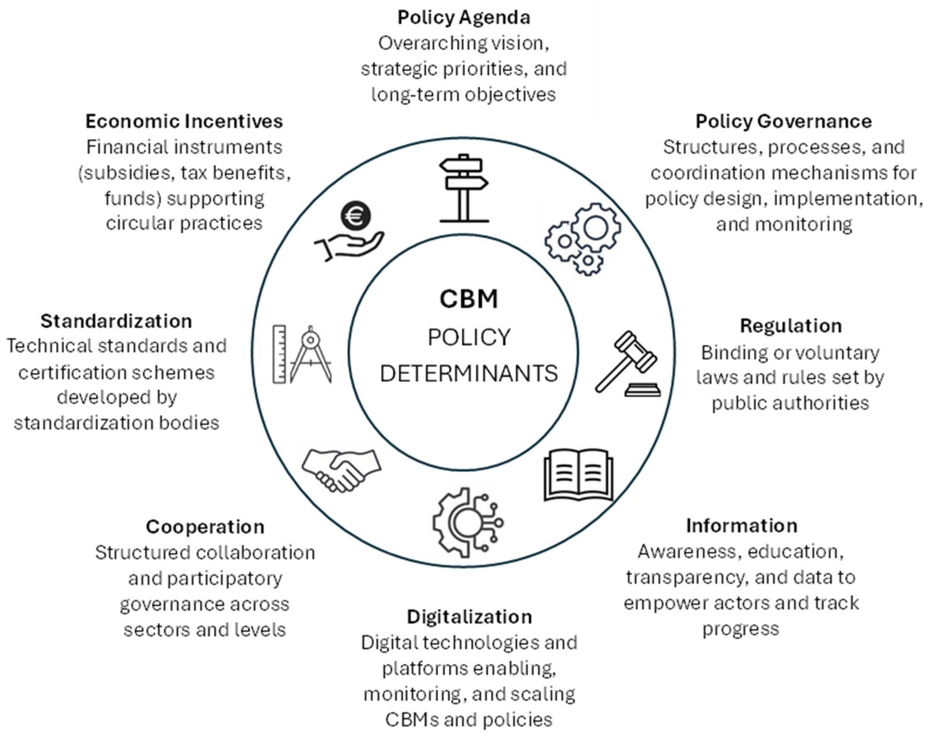 Considering the central role of policy in advancing circularity, and the growing number, diversity, and nature of policy instruments, a gap was identified in the literature: the absence of a dedicated framework that categorizes all relevant CBM-supporting policy instruments into major policy determinant categories. Such a framework should also encompass fundamental aspects of policy conception and implementation, namely policy agenda and policy governance. Recognizing the need to address this gap, the authors identified the necessity to conduct an investigation to capture emerging approaches and trends in CBM-supporting instruments and enabling factors driven by policy action. In light of these considerations, the main objectives of this research are: (i) to identify and categorize, based on a literature review, the key policy determinants supporting the adoption of CBMs; (ii) to develop a comprehensive analytical framework that systematically maps the relevant policy instruments and enablers to be considered for supporting CBMs; and (iii) to provide actionable insights for policymakers and researchers to assess existing policy landscapes, identify gaps, and design integrated policy mixes tailored to specific contexts.