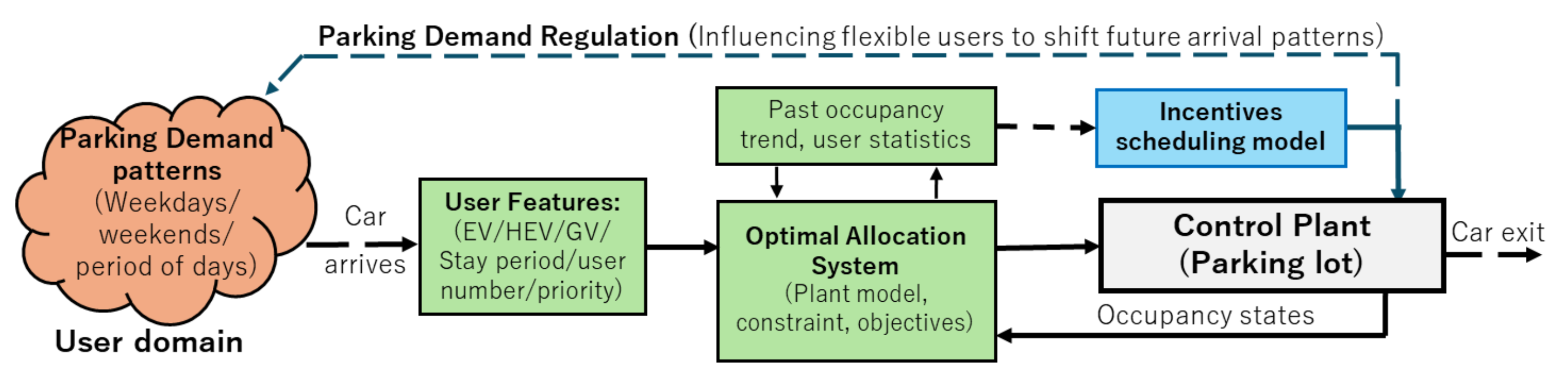 - Sakib, N.; Bakibillah, A.S.M.; Kamal, M.A.S.; Yamada, K. An incentive-based parking management system for reducing congestion during peak demands. In Proceedings of the SICE International Symposium on Control Systems (SICE ISCS), Osaka, Japan, 3–5 March 2025; pp. 113–118. [Google Scholar]