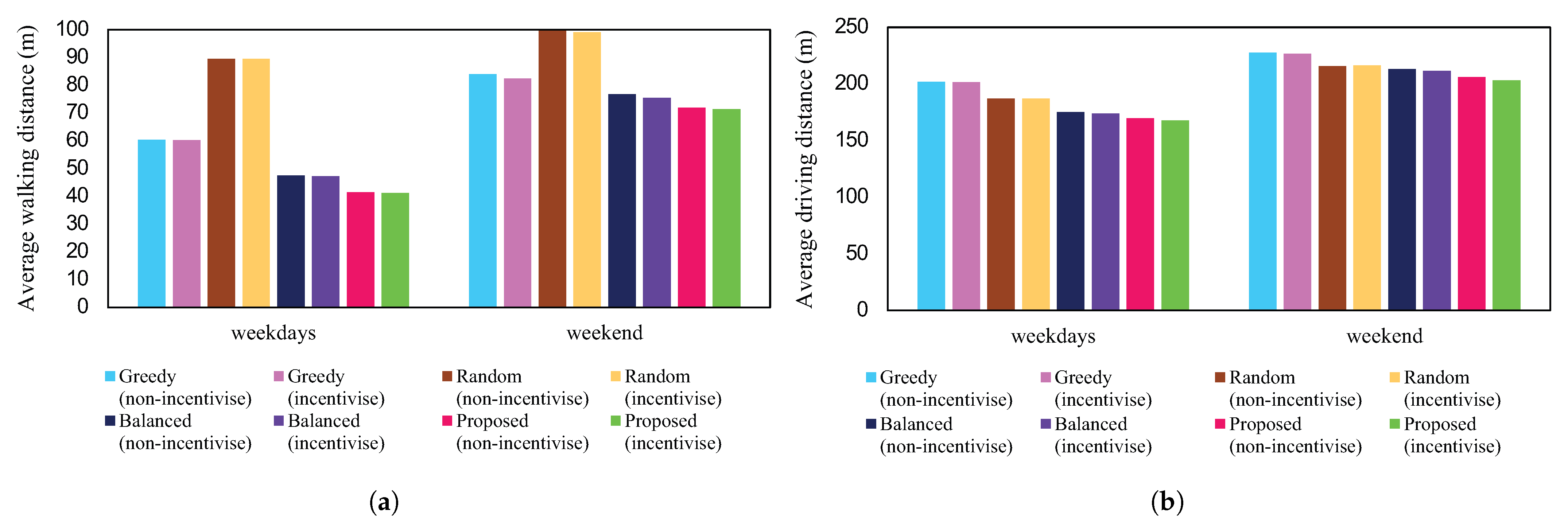 - In the greedy method (i), we set (ignoring driving distance entirely). The cost then reduces to just , and the allocation decision for car n is to choose the spot with the minimum walking distance:Here, denotes the set of available parking spaces for allocation. The shortcomings of this method are that it can lead to many drivers converging on the few closest spots, potentially causing conflicts and localized congestion near the entrance during peak periods.