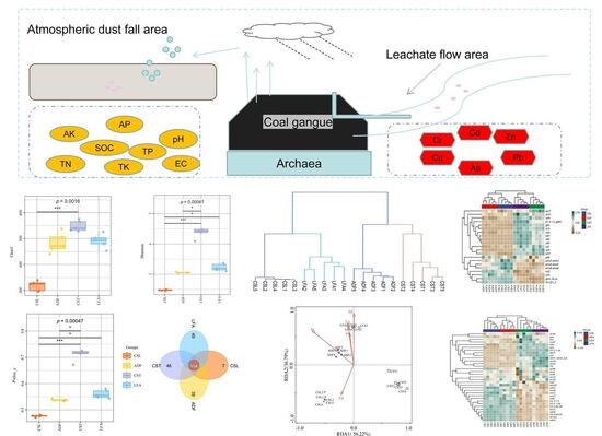 Coal gangue (CG) is a solid waste byproduct of coal mining, rich in mineral components, organic matter, and heavy metals [1,2,3]. By 2023, China’s accumulated stockpile of CG had reached 7 billion metric tons [2,4]. Long-term open-air storage of CG releases coal dust, heavy metals, and other pollutants, which alter the physicochemical properties of surrounding soils, such as pH, organic carbon content, and heavy metal concentrations through atmospheric deposition, rainfall, infiltration, and leaching [5,6]. These changes further impact the structure and function of soil microbial communities in adjacent areas [7].