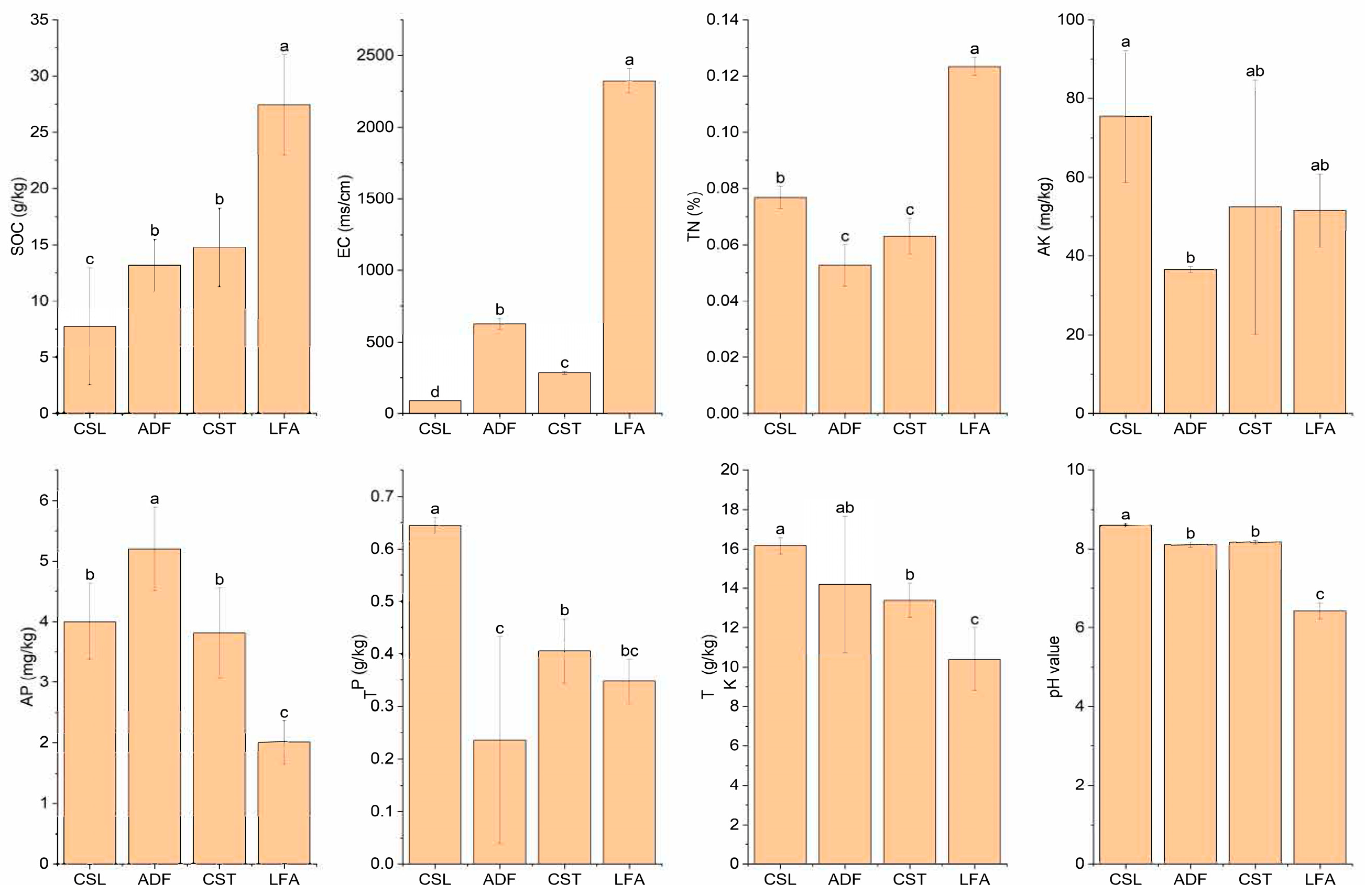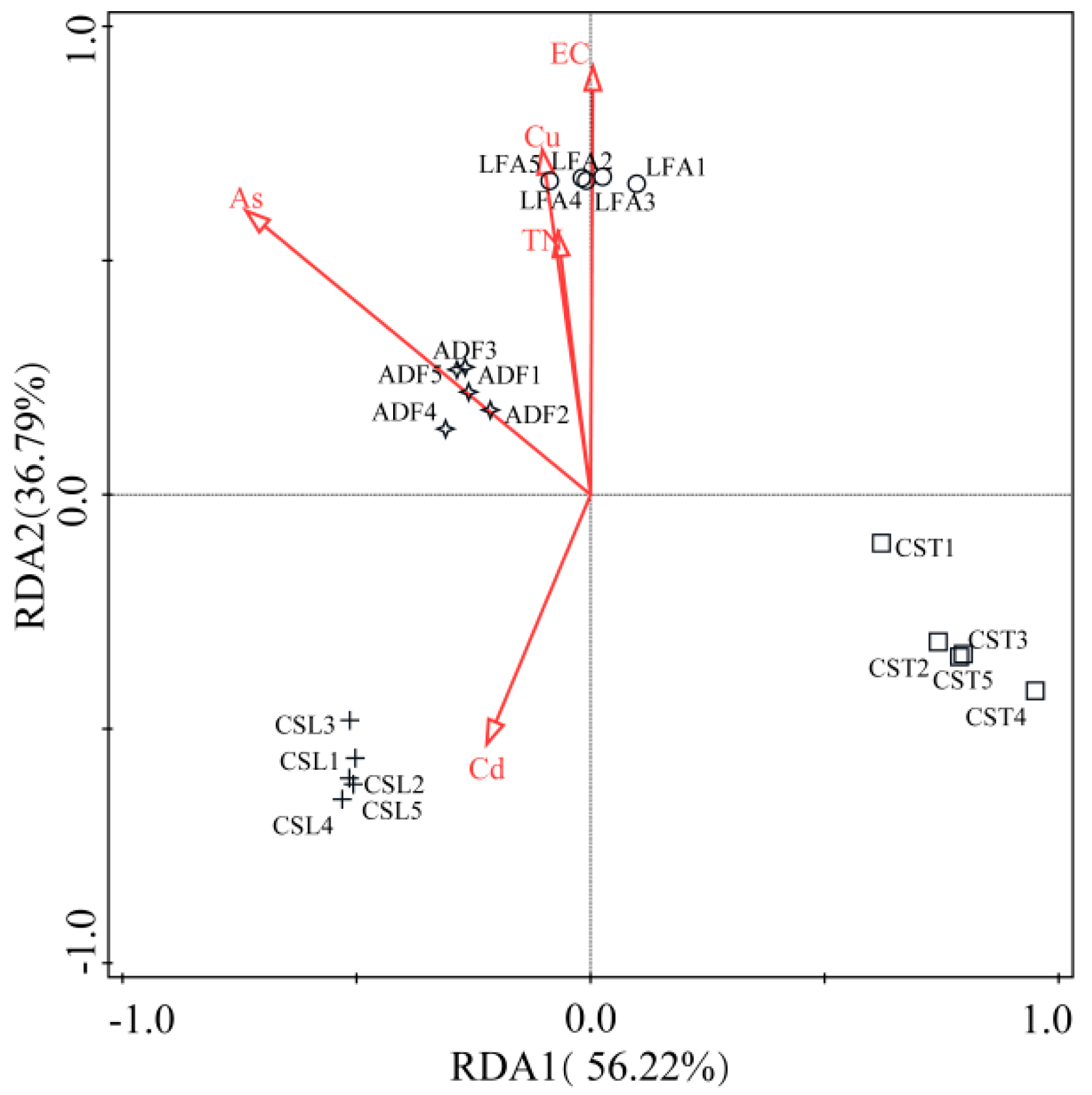 The heavy metal contents of soils under different treatments are presented in Figure 2. The stockpiling of coal gangue increased heavy metal concentrations in surrounding soils, with the following trends: Cr, Cu, and Zn were LFA > ADF > CST > CSL; As was LFA > ADF > CSL > CST; Cd was CSL > CST > ADF > LFA; and Pb was LFA > CST > CSL > ADF. As shown in Figure 3, only the soil in the LFA was slightly acidic, while the soils in the other areas were alkaline. The sediments in the LFA exhibited the highest levels of EC, SOC, and TN, while the soil in the ADF had the highest AP content.