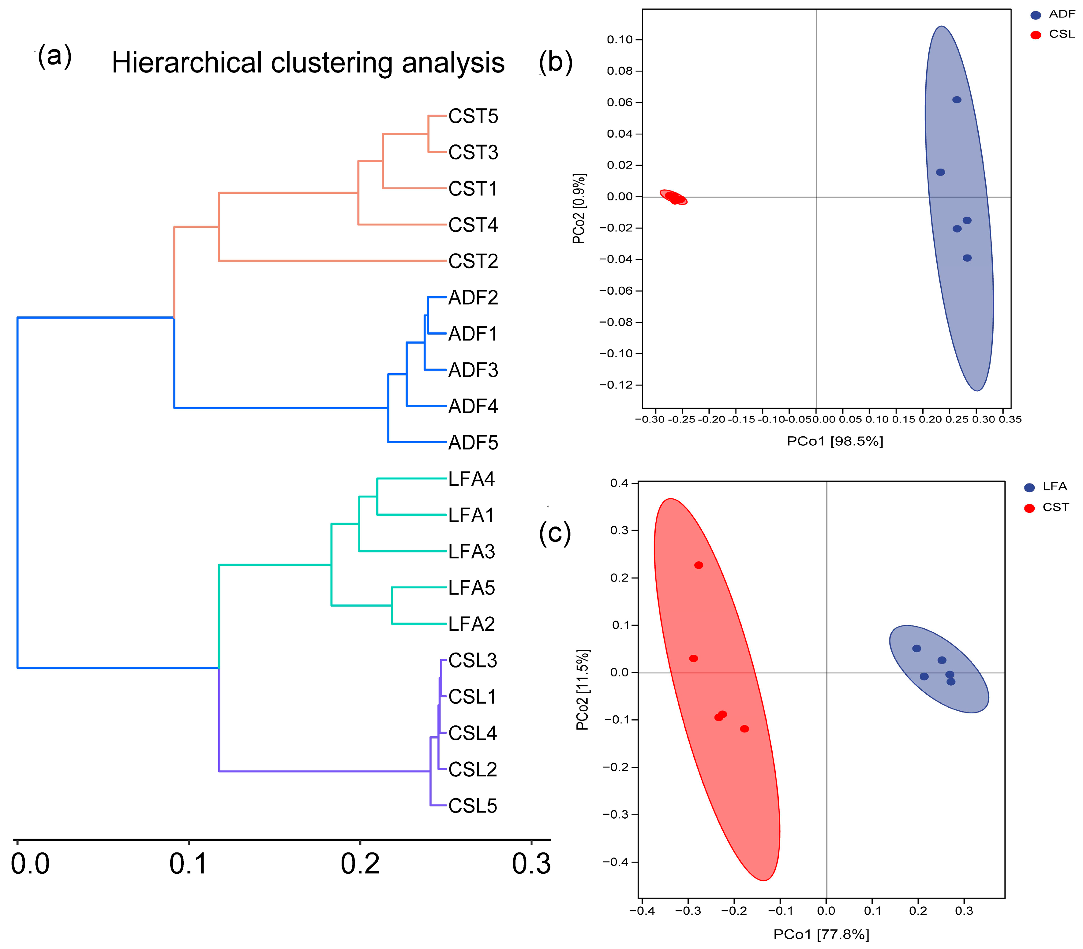 Figure 9. Functional diversity of archaeal communities in different disturbed areas of CG dump; represents result by hierarchical cluster (a); results by PCoA analysis (b,c).