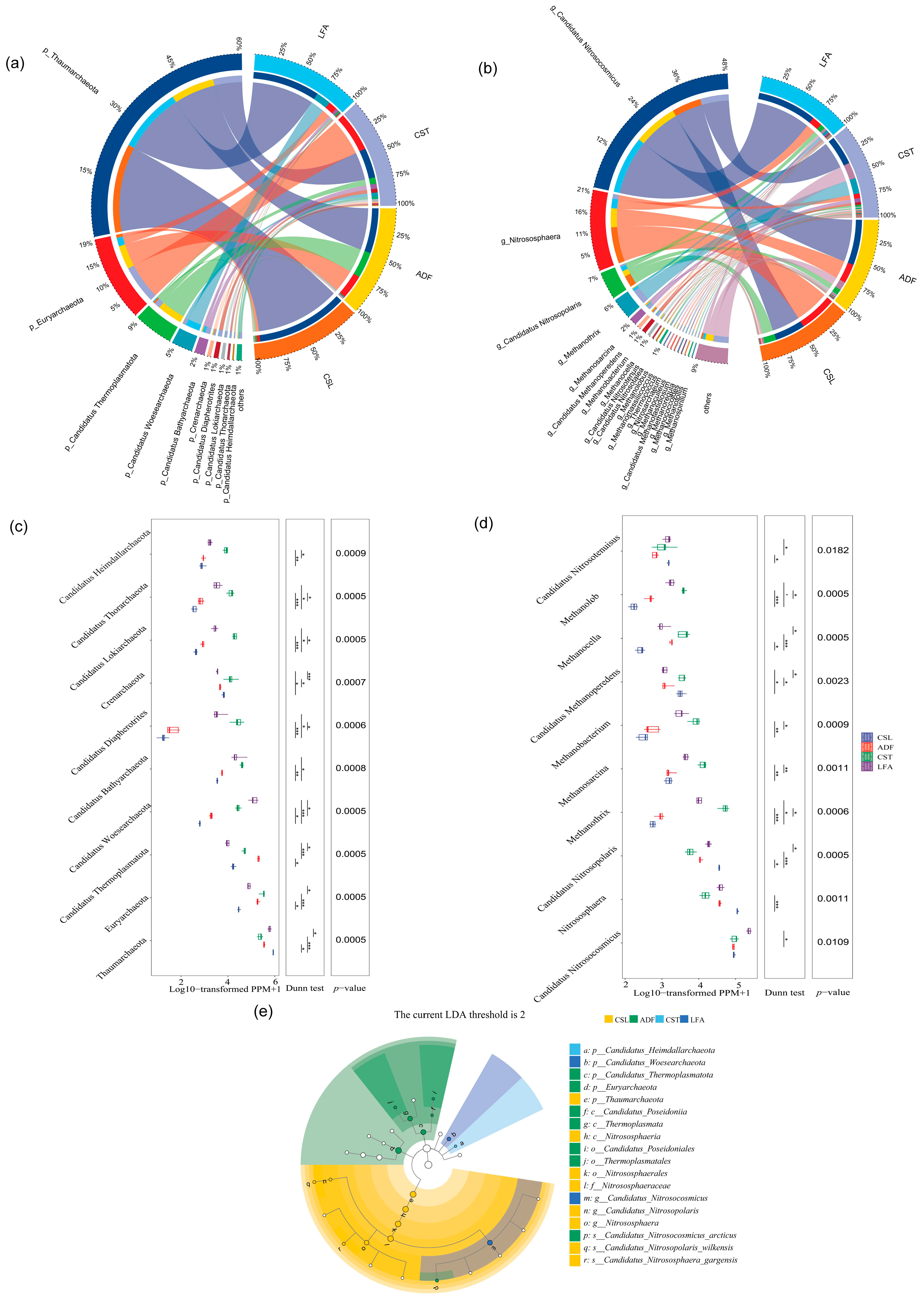 The proportion of valid sequences obtained by metagenomic sequencing was 96.85–97.51% under different treatment zones (Table S1). Significant differences (p < 0.05) were observed among treatment zones, as shown in Figure 4a–c, with the following hierarchy for all diversity indices: CST > LFA > ADF > CSL. Sediments in the LFA showed substantially altered archaeal communities due to strong coal gangue disturbance. From Figure 4d, the LFA has the highest number of unique species, while the CSL has the lowest, only seven. These results demonstrate that the storage of coal gangue created spatially heterogeneous effects on soil archaeal ecosystems, with the influence of leachate and atmospheric deposition differing significantly.
