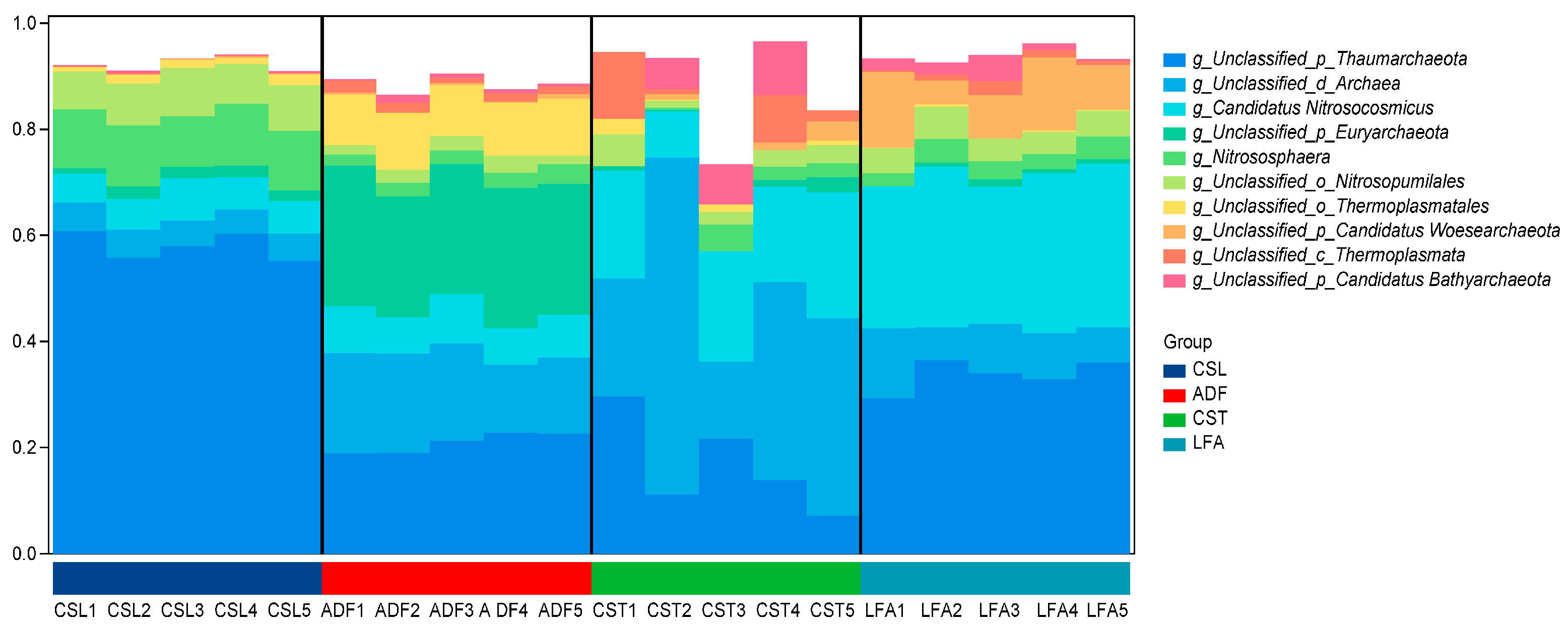 The archaeal community of the ADF, CSL, LFA, and CST were clustered into four categories according to similarity, indicating that the disturbance of CG led to differences in archaeal community structures (Figure 5a). From the results of PCoA (Figure 5b,c), we could find that there were significant differences in the β-diversity of archaeal communities between the ADF and CSL, as well as a similar result between the LFA and. This explained why the archaeal community structure in the areas disturbed by the CG dump was significantly changed compared with that in the undisturbed areas.