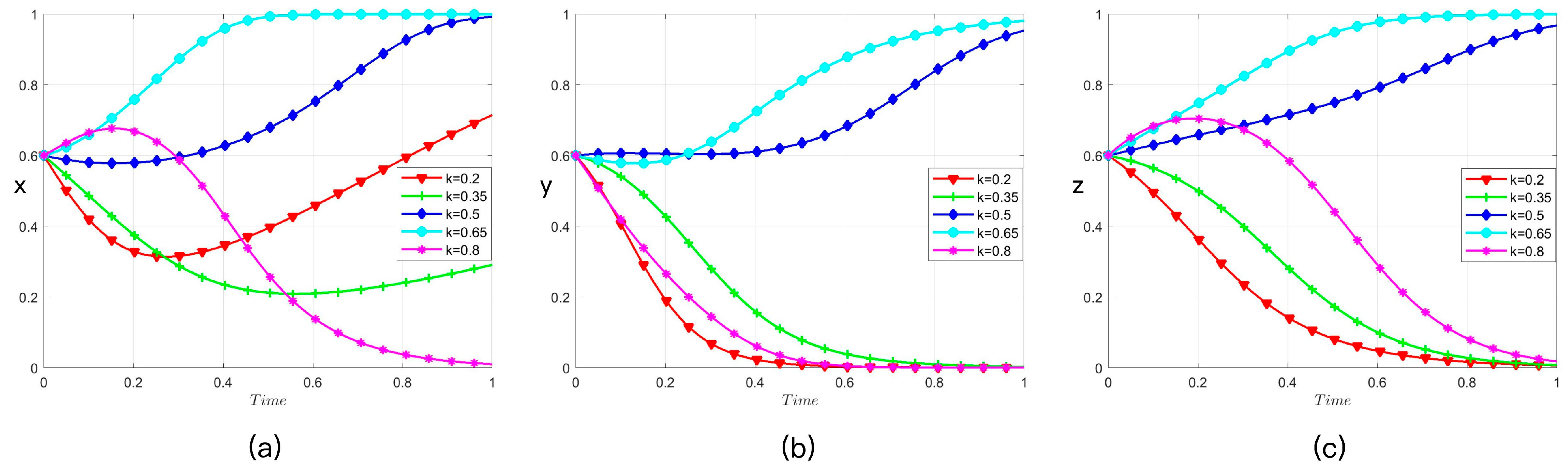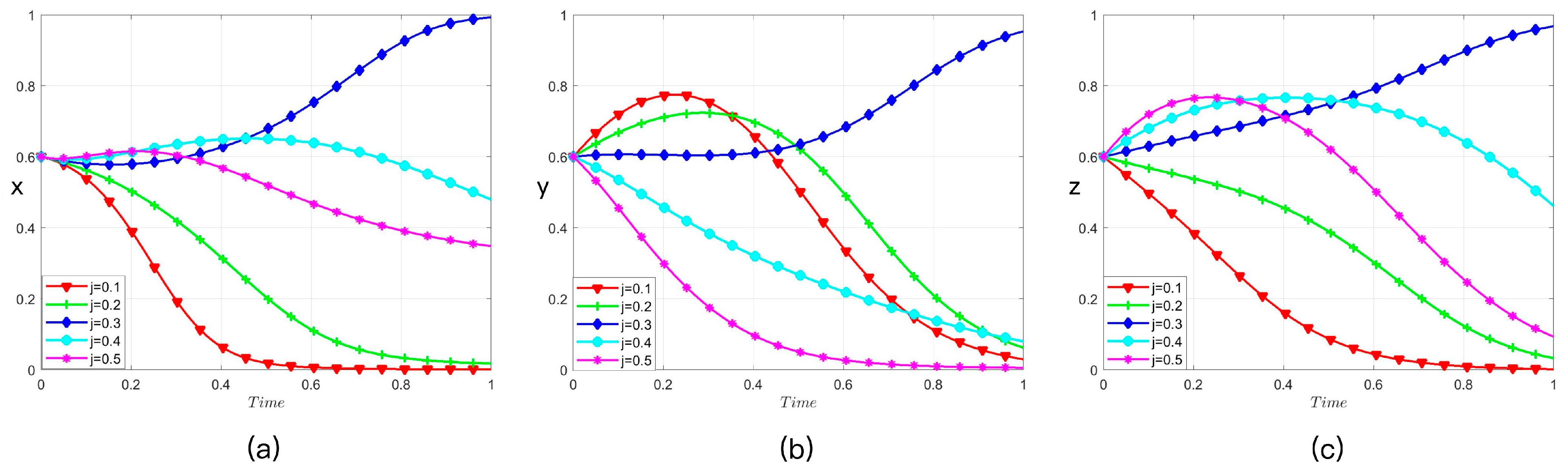 Variations in j have a decisive effect on strategic convergence. Only an appropriately calibrated j promotes convergence toward active strategies for all three parties; both an insufficiently low or an excessively high j lead to convergence to passive strategies. Specifically, at low values (j = 0.1, 0.2), all three parties tend to converge to passive behavior. As j increases to 0.3, the tripartite dynamics gradually shift toward active behavior. However, a further increase in j beyond 0.4 causes the system’s trajectory to revert toward passive behavior.