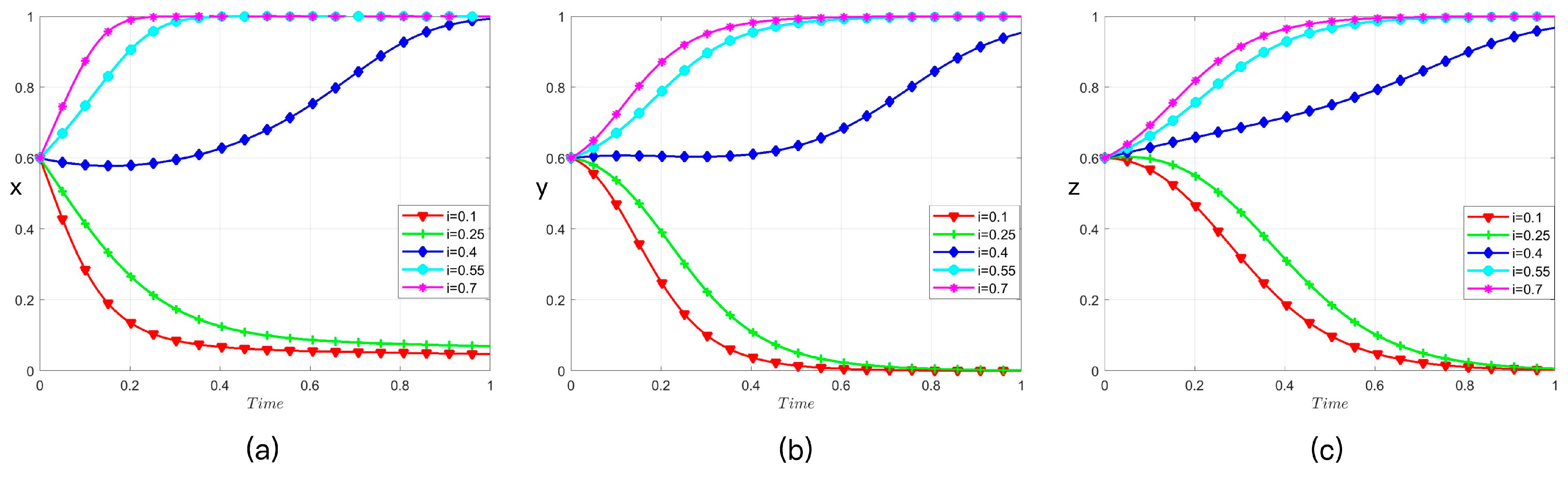j) the values of 0.1, 0.2, 0.3, 0.4, and 0.5 sequentially and simulate its effect on the evolutionary strategies of the three players, as illustrated in