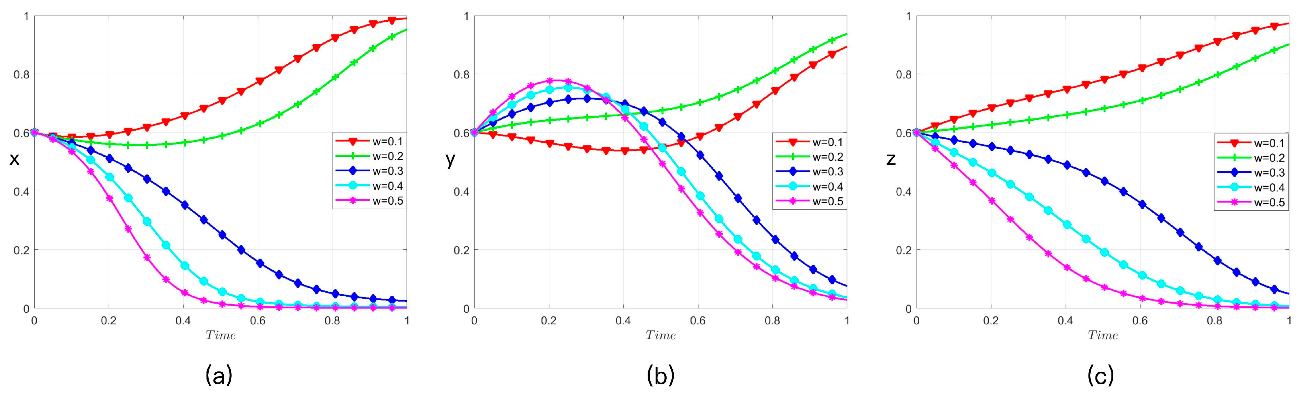 w) the values of 0.1, 0.2, 0.3, 0.4, and 0.5 sequentially and simulate its effect on the evolutionary strategies of the three parties, as illustrated in