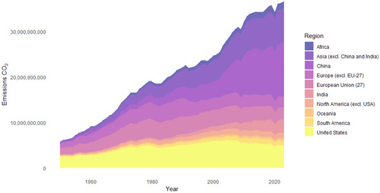 - Our World in Data. Annual CO2 Emissions by World Region. 2024. Available online: https://ourworldindata.org/grapher/annual-co-emissions-by-region (accessed on 13 March 2025).