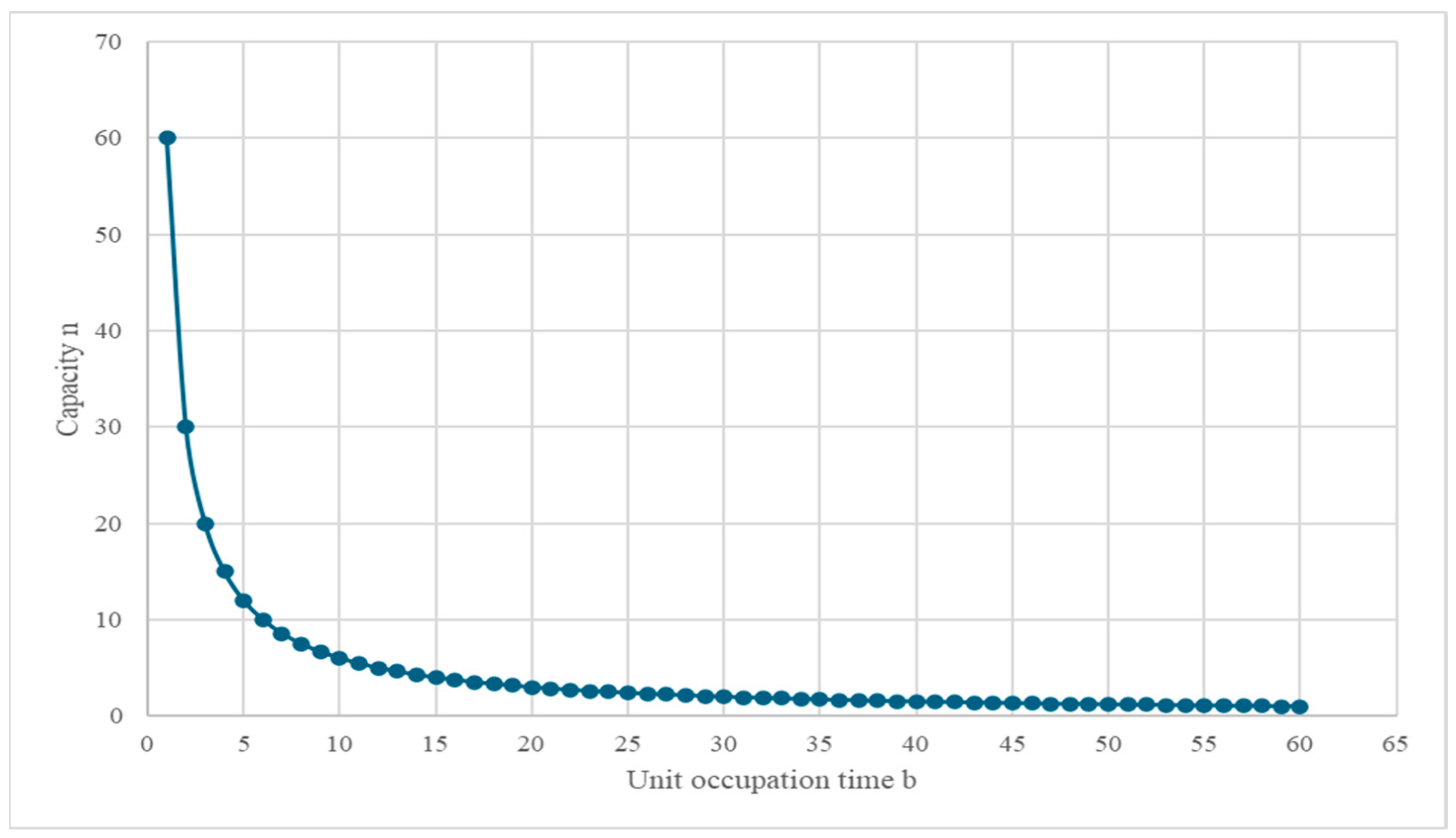 - n—Infrastructural capacity is defined as the number of feasible journeys that can be accommodated on a given infrastructure within a specified time period. The relation between capacity and unit occupancy time over the course of a one-hour monitoring period is pictured in Figure 1 [-];