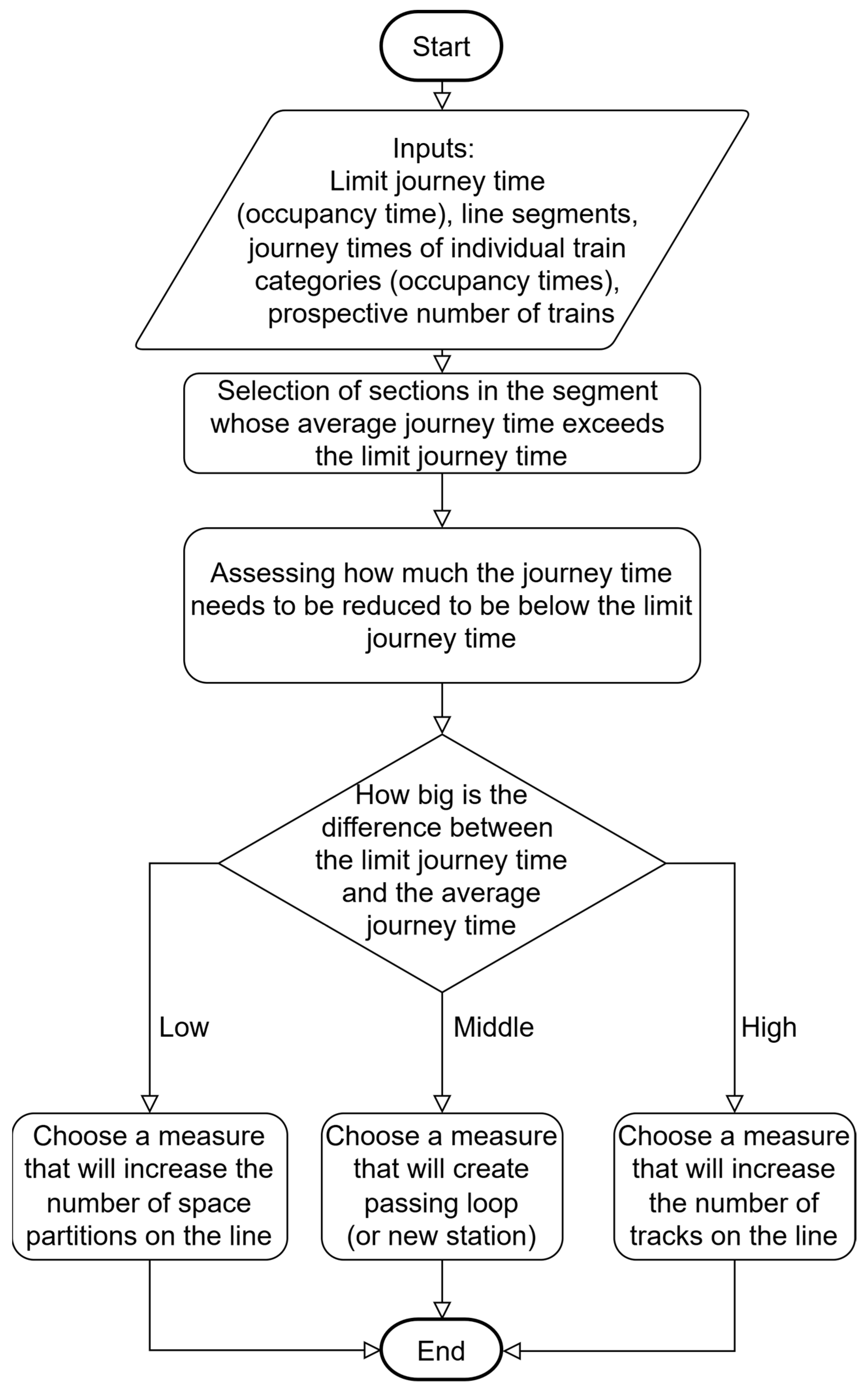 - The identification of infrastructure improvements—the methodology was developed to facilitate the identification of critical sections of the railway line where infrastructure improvements are necessary. These improvements may include dividing the track into discrete block sections, adding track branches such as stations or passing loops, or increasing the number of tracks. These measures are proposed for sections where journey times exceed the limiting value, ensuring that the railway system can meet future demands effectively and efficiently.