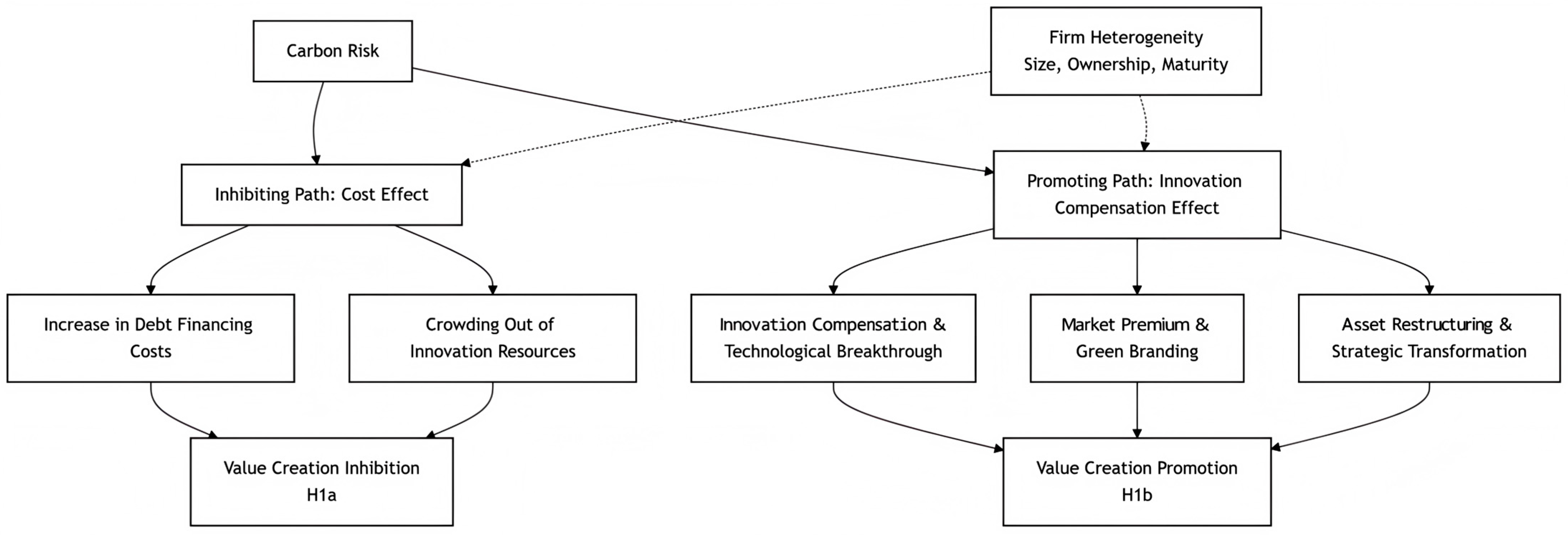 Figure 1) to systematically explain how carbon risk influences corporate value creation through the “cost effect” and “innovation compensation effect,” and proposes competing hypotheses.