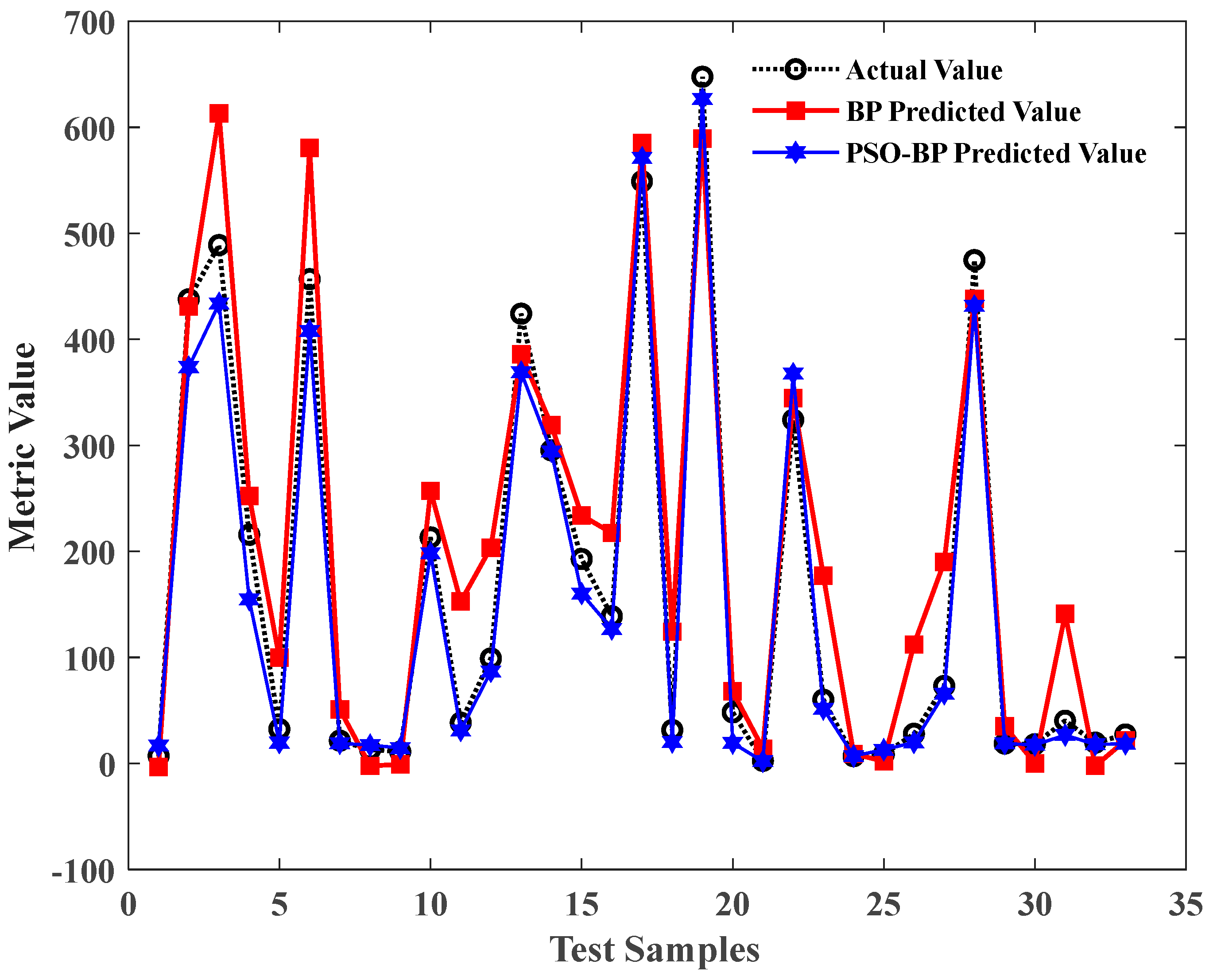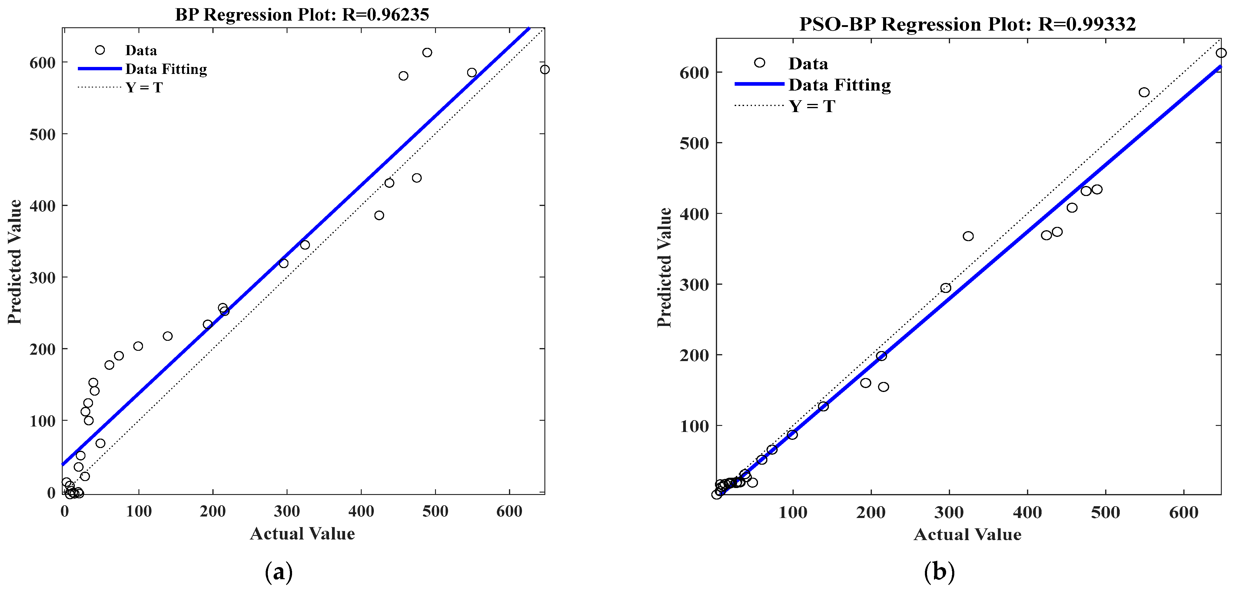 - By incorporating driving variables such as gross domestic product, urbanization rate, and total value of the secondary industry, and optimizing the weights of the BP neural network using particle swarm optimization, the model’s error has significantly decreased, with the RMSE dropping from 34.1638 to 21.5566 and the R2 rising from 0.9577 to 0.9880, This is consistent with the PSO-BP applied by Wang et al. [17] in forecasting for new energy vehicles, which further verifies the effectiveness of the particle swarm optimization (PSO) algorithm in improving the accuracy of the BP neural network.