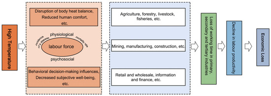With the continuous warming of the global climate and the frequent occurrence of extreme high temperatures, the economic development of human societies is seriously threatened. The Intergovernmental Panel on Climate Change (IPCC) pointed out in its Sixth Assessment Report Synthesis [1] that extreme weather is exerting increasingly dangerous impacts on nature and people in every region of the world, and that the current global average temperature is 1.1 °C higher than pre-industrial levels. The potential global income loss from reduced labor capacity during extreme heat events is estimated at 863 billion dollars, with the most severe impacts in the agricultural sector [2]. The Lancet Countdown to China Report, published in 2023, showed that the potential loss of labor time due to heat exposure for the year 2022 is 38.3 billion hours, averaging 46.6 h per worker, with associated economic loss amounting to approximately 3055 dollars. Labor productivity is defined as the ratio of the output created by a worker in a given period of time to the total amount of labor he or she consumes. At the macroeconomic level, it is typically measured by output per hour worked or production per employer [3]. Yaglou and Minard introduced the Wet Bulb Globe Temperature (WBGT) index in 1957 [4], which was accepted by the International Organization for Standardization (ISO) and the U.S. Conference of Governmental Industrial Hygienists as a tool for assessing hot environments [5]. High temperatures affect the urban economy through both direct and indirect pathways [6,7,8,9,10]. High-temperature heat waves can affect the physiological health of workers, including chronic diseases, heat-related illnesses (e.g., heat exhaustion, pyrexia), and cardiovascular, cerebrovascular, and respiratory conditions [11,12,13,14,15,16]. At the same time, long-term high-temperature environments can also negatively affect the mental health of workers [17,18], such as emotional fluctuations, irritability, depression, etc., and these psychological problems can also affect labor productivity (Figure 1).