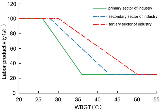 For this reason, Kjellstrom et al. assumed that 200 W corresponds to the service industry, 300 W corresponds to manufacturing jobs, 400 W corresponds to agricultural jobs, etc., and categorized the different labor intensities according to the corresponding industries [31]. Based on Kjellstrom’s study, Roson et al. [32] used the overall average to determine the functional relationship between the WBGT index and labor productivity in the three industries (Figure 3), and proposed that the minimum value of the WBGT index for agriculture, manufacturing and service industries are 26 °C, 28 °C and 30 °C, respectively. When the minimum labor productivity is 25%, the corresponding WBGT indices for agriculture, manufacturing and service industries are 36 °C, 43 °C and 50 °C, respectively.