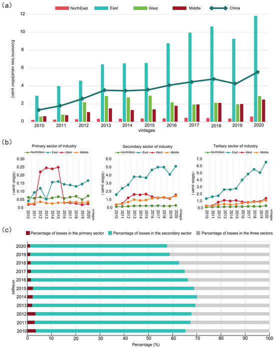 From a national perspective, the average economic losses of the secondary industry are the highest, followed by the average economic losses of the secondary industry, and the average economic losses of the primary industry are the lowest (Figure 4c). The characteristics of the average economic losses of the three industries in the four major regions are the same, with the average economic losses of the secondary industry accounting for more than 50% for ten consecutive years.