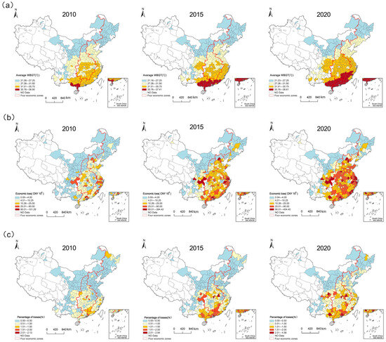 During the study period, the average value of the national WBGT index increased year by year. Compared to 2010, the average value of the national WBGT index in 2020 increased by 1.69 °C (Figure 5a). Using formulas to calculate, the economic losses of 278 cities above prefecture level in China under the influence of high temperature from 2010 to 2020 is derived (Figure 5b), and the proportion of economic losses to urban GDP is also calculated to reflect the degree of influence of high temperature on the economy of each city. In 2010, there were two cities whose economic losses were in the high value zone, namely Guangzhou and Shenzhen, with total economic losses amounting to 10.13 billion yuan and 9.75 billion yuan, respectively. In 2015, a total of 11 cities were in the high economic loss zone, including Shenzhen, Guangzhou, Chongqing, Shanghai, Dongguan, and Foshan, among others. The economic losses of all these cities exceeded 223.65 million yuan, with Shenzhen reaching the highest of 677.88 million yuan. In 2020, a total of 21 cities were in the high economic loss zone, with the top ten cities including Shenzhen, Shanghai, Guangzhou, Chengdu, Beijing, Dongguan, Chongqing, Suzhou, Hangzhou, and Fuzhou. All of these cities suffered economic losses of more than 15 billion yuan, with Shenzhen having the highest loss, reaching 45.44 billion yuan. Overall, the losses caused by high temperatures to China’s urban economy intensified year by year during the research period, with cities along the southeastern coast being the most severely affected, and gradually spreading to inland and northern cities.