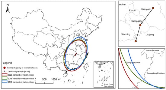 The azimuth angle has shown a gradually increasing trend in the last 10 years. It increased from 20.49° in 2010 to 21.52° in 2015 and then to 24.23° in 2020, and the spatial pattern of “northeast–southwest” has not changed significantly. The major axis of the ellipse has shortened from 963.48 km in 2010 to 886.73 km in 2020, and the minor axis has increased from 558.14 km in 2010 to 575.85 km in 2020, indicating that the distribution of the economic losses is becoming more and more concentrated in the north–south direction and more dispersed in the east–west direction (Table 4).