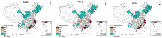 According to the global Moran’s I, the spatial clustering characteristics of economic losses in Chinese cities are significant. Therefore, this study utilizes local Moran’s I maps for 2010, 2015, and 2020 to reveal the transitional characteristics of dynamic loss to the urban economy caused by high temperature. Figure 7 illustrates the LISA map of economic losses caused by high temperatures in Chinese cities, revealing a single spatial clustering pattern of high temperature economic losses with local spatial autocorrelation. The main types are high–high agglomeration (HH) and low–low agglomeration (LL). The number of cities with HH agglomeration gradually decreased from 24 in 2010 to 21 in 2015, and then increased to 25 in 2020, while the number of cities with LL agglomeration increased from 74 in 2010 to 76 in 2015, and then decreased to 73 in 2020. The degree of agglomeration in the HH agglomeration area varied slightly, mainly concentrated in the eastern and southern regions, such as Guangdong, Zhejiang, Jiangsu, and Fujian. In the later period, the cities in the LL agglomeration area are mainly distributed in the three northeastern provinces and Shaanxi, Gansu, and Ningxia in the northwestern region. Meanwhile, the number of LL agglomeration areas in the southwest is gradually decreasing.