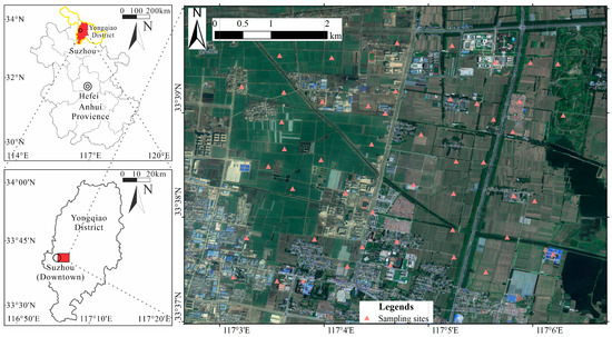 The study area is located in the eastern Yongqiao District of Suzhou City, northern Anhui Province, with geographical coordinates of 117°3′ to 117°7′ E and 33°37′ to 33°40′ N, as shown in Figure 1. The primary soil types found in this area include brown soil, tidal soil, and Shajiang black soil. The crops suitable for growth include corn, millet, oilseed, naked oats, beans, and potatoes. There are large areas of farmland in the study area, where pesticide use is intensive, with this being one of the potential sources of heavy metal pollution. There are multiple equipment manufacturing enterprises within the study area, located close to coal mines, meaning they could also be potential pollution sources. The southern area within the study zone is an urban expressway with heavy traffic flow, so it may also contribute to heavy metal pollution. The research area is characterized by a relatively flat landscape that gently inclines from the northwest to the southeast, while the riverbank displays a curve along the river stretch. Suzhou belongs to a warm temperate semi-humid monsoon climate zone, characterized by a mild climate, four distinct seasons, rain and heat in the same season, sufficient sunshine, and moderate rainfall. However, the distribution of precipitation in each season is extremely uneven, with summer precipitation being highly concentrated, accounting for 50% to 60% of the annual precipitation. The rivers within the territory of Suzhou belong to the Huai River system and are near Xinbian River and Tuo River. The groundwater in the region is relatively shallow and belongs to the Quaternary loose rocks in the hydrogeological area of the Huaibei Plain. The aquifer rock formations are distributed throughout the entire area, and the Holocene aquifer rock formations are the most widely distributed. The average annual recoverable coefficient of the 0~40 m shallow aquifer is 0.65, with rainwater accounting for the majority.