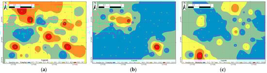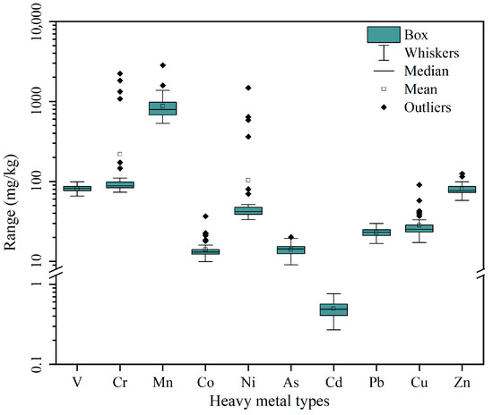 Table 5 summarizes the concentrations of heavy metals in soil samples collected across the study area. When ordered by average content from highest to lowest, the metals are ranked as follows: Mn > Cr > Ni > V > Zn > Cu > Pb > Co > As > Cr > Cd. Based on comparative analysis of background values, the mean concentrations of all measured elements, with the exception of V and Pb, exceed regional background levels, indicating that anthropogenic activities have caused significant enrichment of heavy metals in the study area [37,38]. The coefficient of variation (CV) can reflect the average level of variation in various points in the total sample. The larger the coefficient of variation, the more uneven the distribution of elements in the soil and the level of interference by human activities [39]. The large CV values of Ni and Cr indicate that the spatial distribution of these two elements varies greatly, suggesting the existence of hotspots causing their pollution. The CV values of other elements are relatively small, indicating that the spatial distribution differences are small. This might be due to the relatively uniform distribution of pollutants or the existence of a prolonged diffusion process. A distribution map of heavy metal content in soil, generated by ArcMap 10.8, is shown in Figure 2. The pollution patterns of heavy metals V, Cd, and Pb exhibit similar spatial distributions, primarily concentrated in the northern, southeastern, and southwestern areas of the study area. The distributions of Cr, Co, Ni, and Cu pollution was focused in the northwestern and southeastern areas, while Mn, As, and Zn show characteristics clustered in the north–central and southwestern areas.