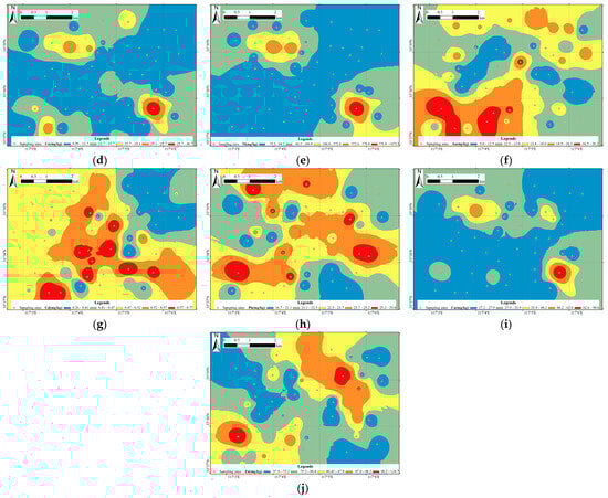 Distribution map of heavy metal content in soil: (a) V, (b) Cr, (c) Mn, (d) Co, (e) Ni, (f) As, (g) Cd, (h) Pb, (i) Cu, and (j) Zn.