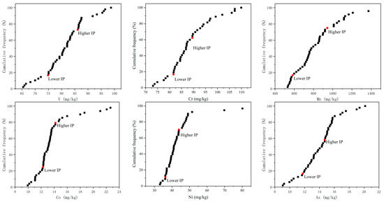 There are two inflection points on this curve. The lower inflection point (IP) indicates the upper limit of the natural concentration, while the higher IP represents the lower limit of the concentration affected by human activities [33]. If the distribution curve approximates a straight line, the measured sample concentrations may inherently represent the background range.